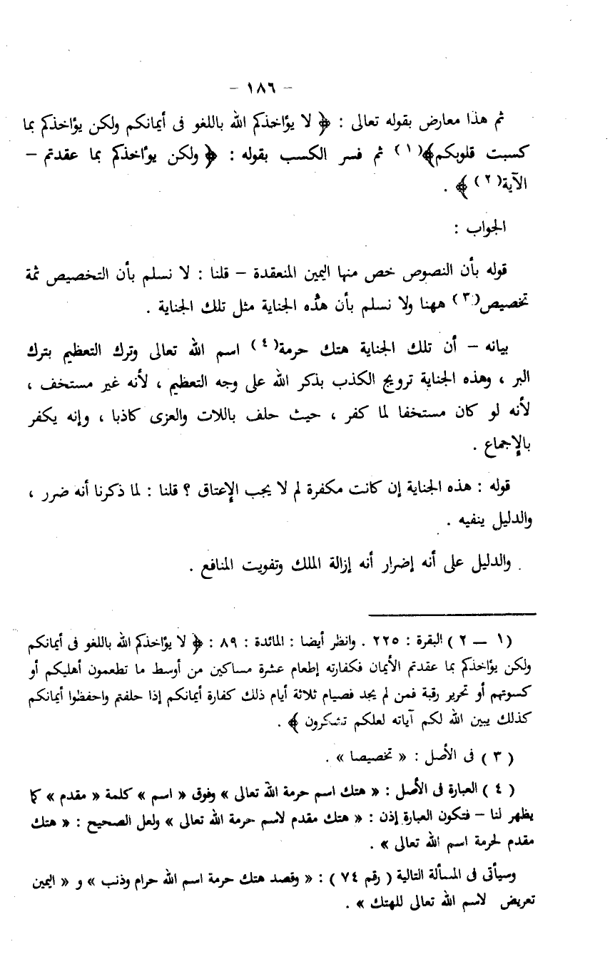 قوله بأن النصوص خص منها اليمين المنعقد- قلنا: لا نسلم بأن التخصص ثمة تخصيص ههنا ولا نسلم بأن هذه الجناية مثل تلك الجناية.