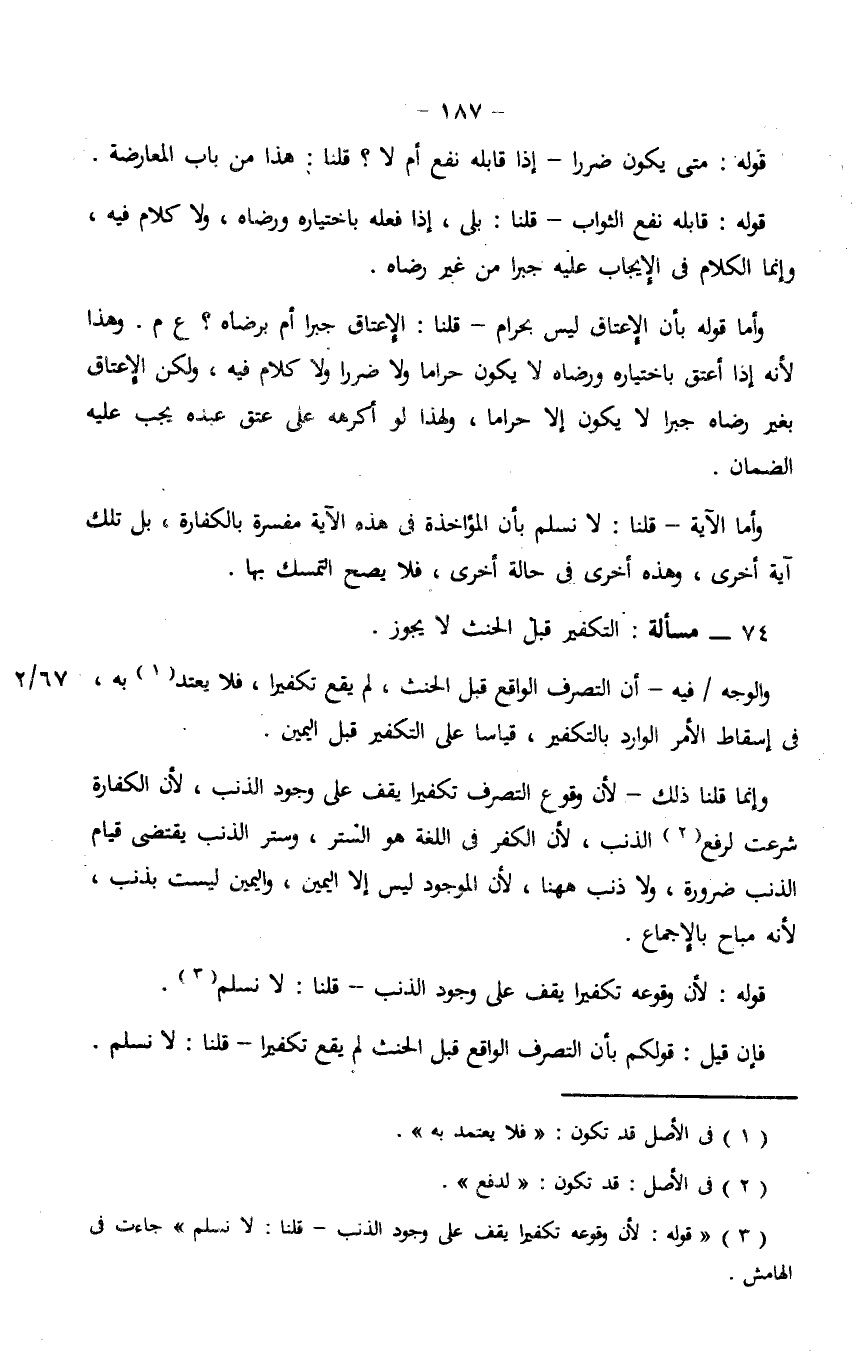 وأما قوله بأن الإعتاق ليس بحرام- قلنا: الإعتاق جبرًا أم برضاه؟ ع م. وهذا لأنه إذا أعتق باختياره ورضاه لا يكون ولا ضررًا ولا كلام فيه، ولكن الإعتاق بغير رضاه جبرًا لا يكون إلا حرامًا، ولهذا لو أكرهه على عتق عبده يجب عليه الضمان.