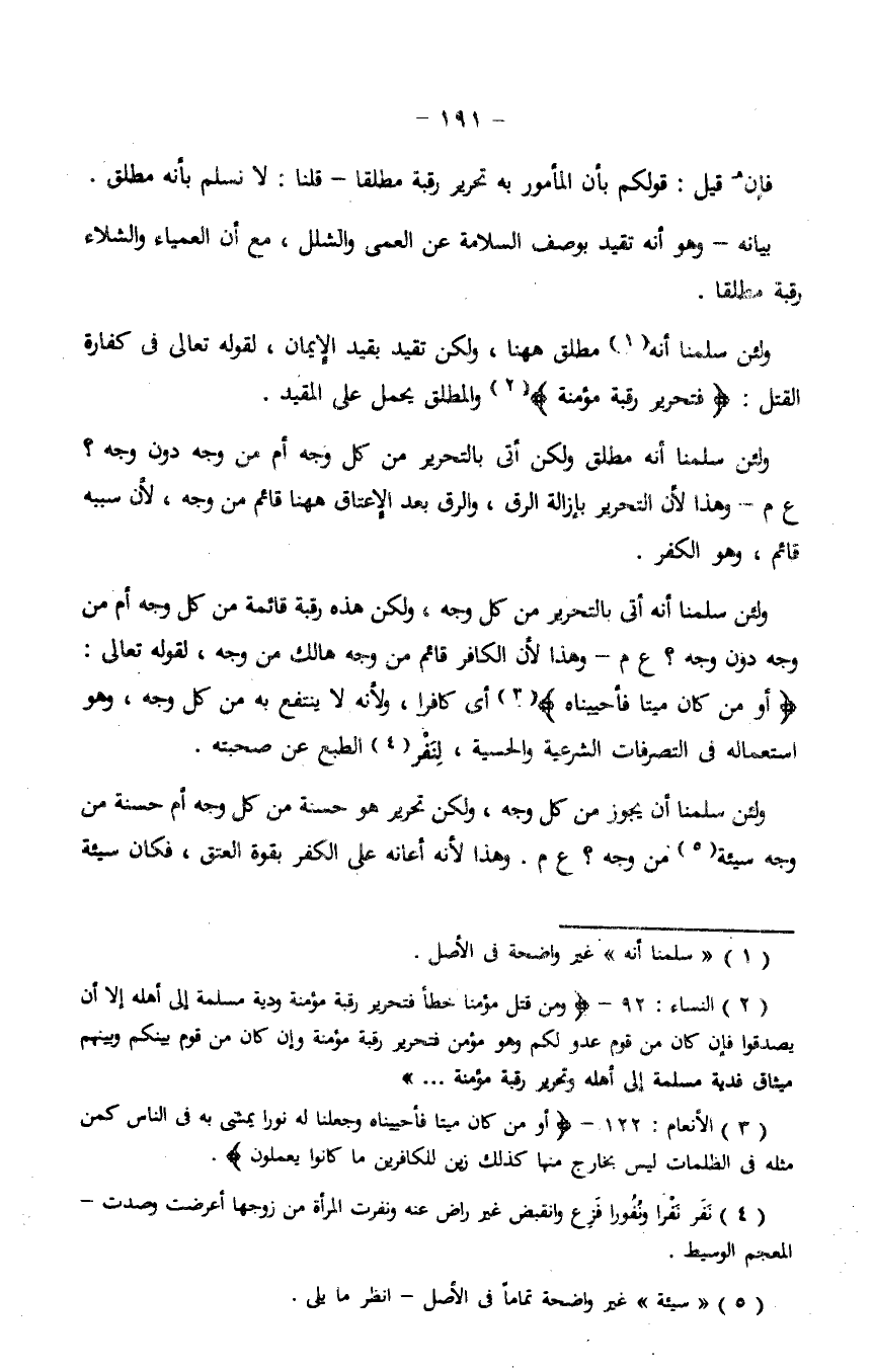 ولئن سلمنا أنه أتى بالتحرير من كل وجه، ولكن هذه رقبة قائمة من كل وجه أم من وجه دون وجه؟ ع م- وهذا لأن الكافر قائم من وجه هالك من وجه، لقوله تعالى: {أَوَ مَن كَانَ مَيْتًا فَأَحْيَيْنَاهُ} أي كافرًا، ولأنه لا ينتفع به من كل وجه، وهو استعماله في التصرفات الشرعية والحسية، لنفر الطبع عن صحبته.