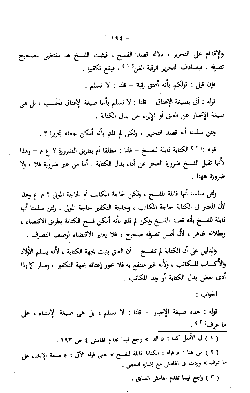 ولئن سلمنا أنها قابلة للفسخ، ولكن لحاجة المكاتب أم لحاجة المولى؟ م ع وهذا لأن المعتبر في الكتابة حاجة المكاتب، وحاجة التكفير حاجة المولى. ولئن سلمنا أنها قابلة للفسخ وأنه قصد الفسخ ولكن لم قلتم بأنه أمكن فسخ الكتابة بطريق الاقتضاء، وبطلانه ظاهر، لأن أصل تصرفه صحيح، فلا يعتبر الاقتضاء لوصف التصرف.