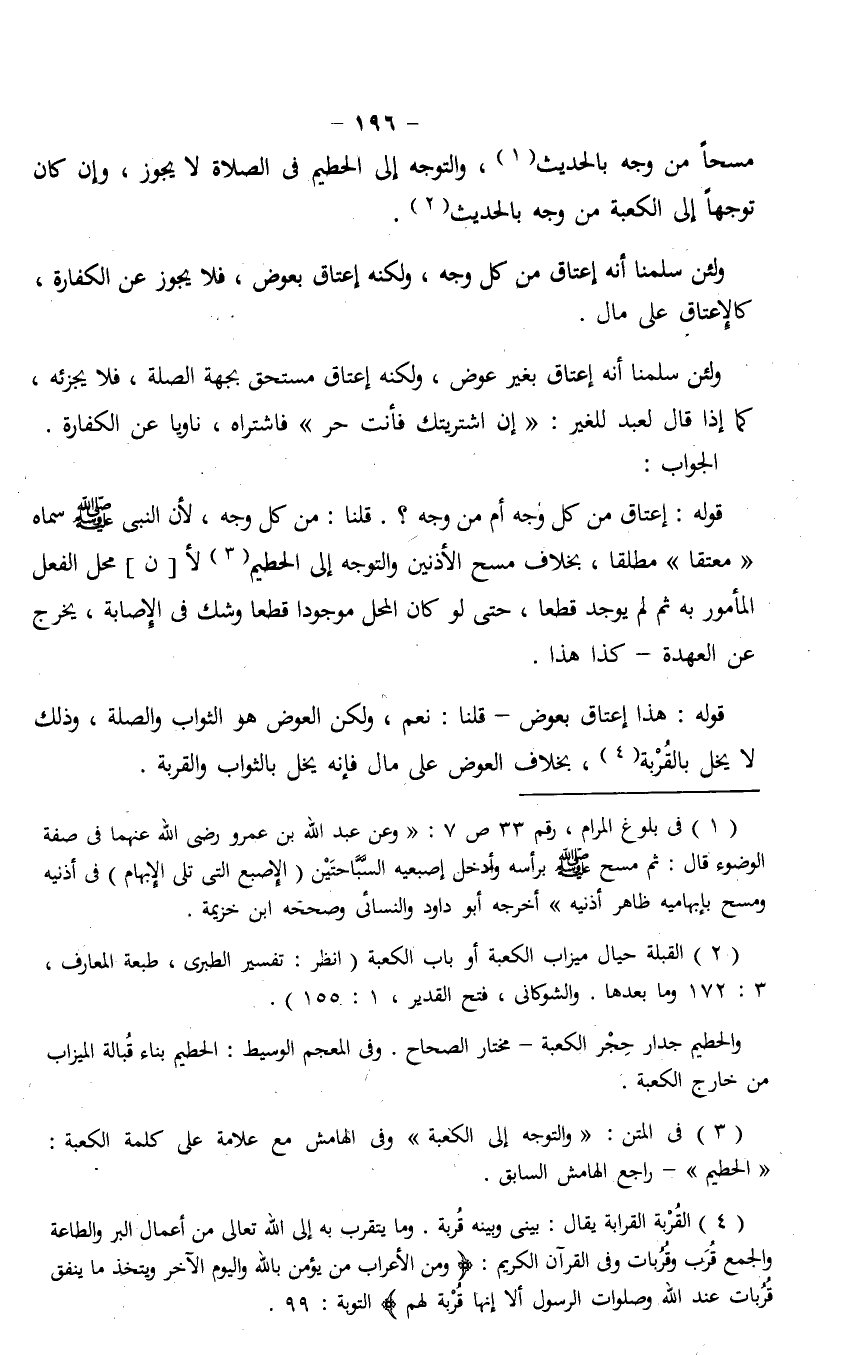 قوله: إعتاق من كل وجه أم من وجه؟ . قلنا: من كل وجه، لأن النبي صلى الله عليه وسلم سماه "معتقًا" مطلقًا، بخلاف مسح الأذنين والتوجه إلى الحطيم لأ [ن] محل الفعل المأمور به ثم لم يوجد قطعًا، حتى لو كان المحل موجودًا قطعًا وشك في الإصابة، يخرج عن العهدة- كذا هذا.
