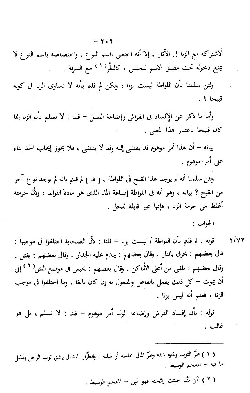 ولئن سلمنا أنه لم يوجد هذا القبح في اللواطة، [فـ] لم قلتم بأنه لم يوجد نوع آخر من القبح؟ بيانه، وهو أنه في اللواطة إضاعة الماء الذي هو مادة التوالد، ولأن حرمته أغلظ من حرمة الزنا، فإنها غير قابلة للحل.