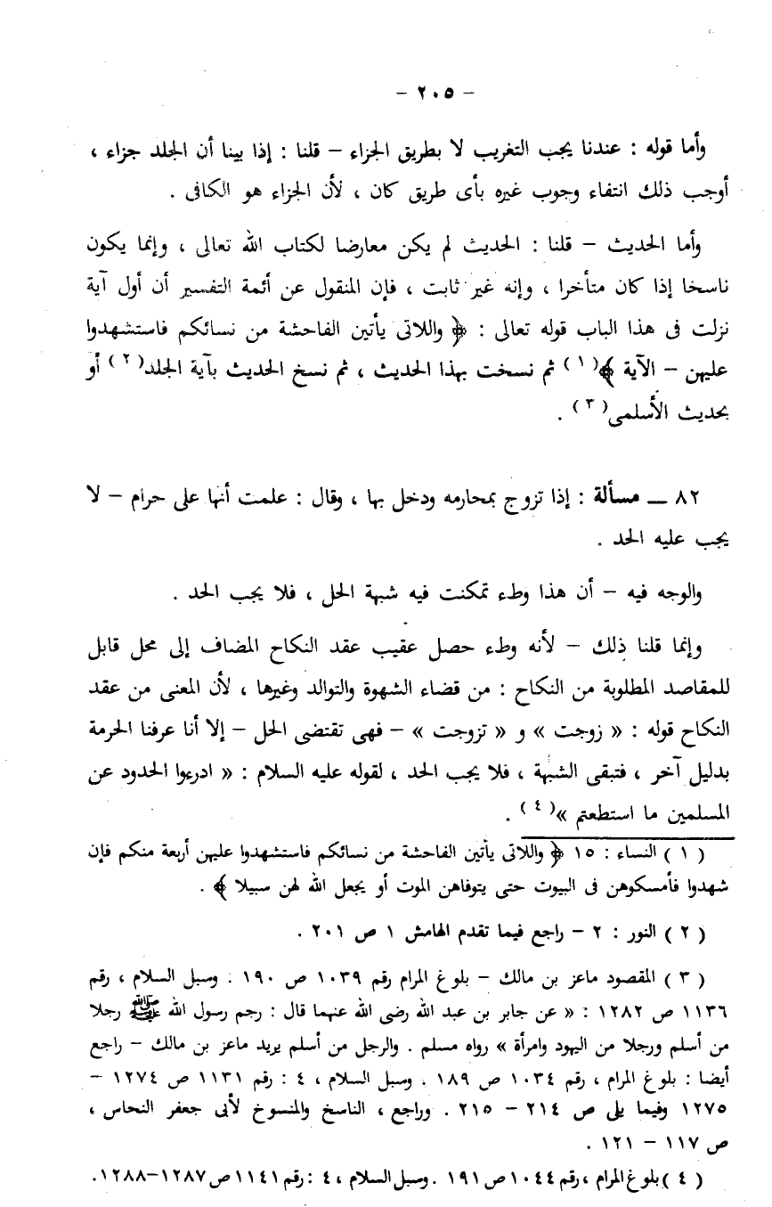 وأما الحديث - قلنا: الحديث لم يكن معارضا لكتاب الله تعالى، وإنما يكون ناسخا إذا كان متأخرا، وإنه غير ثابت، فإن المنقول عن أئمة التفسير أن أول آية نزلت في هذا الباب قوله تعالى: {وَاللَّاتِي يَأْتِينَ الْفَاحِشَةَ مِنْ نِسَائِكُمْ فَاسْتَشْهِدُوا عَلَيْهِنَّ - الآية} ثم نسخت بهذا الحديث، ثم نسخ الحديث بآية الجلد أو بحديث الأسلمي.