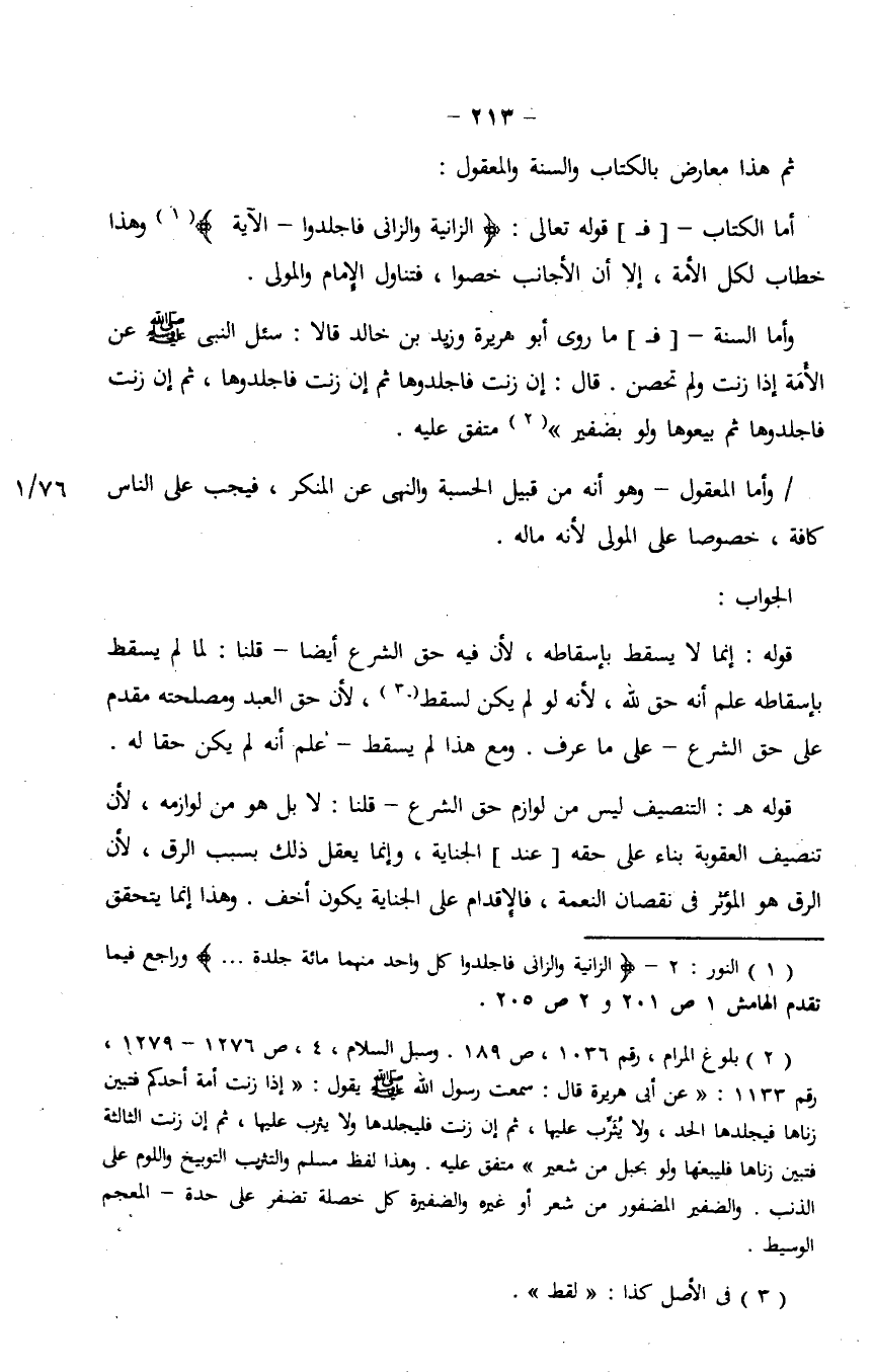 قوله هـ: التنصيف ليس من لوازم حق الشرع- قلنا: لا بل هو من لوازمه، لأن تنصيف العقوبة بناء على حقه [عند] الجناية، وإنما يعقل ذلك بسبب الرق، لأن الرق هو المؤثر في نقصان النعمة، فالإقدام على الجناية يكون أخف. وهذا إنما يتحقق