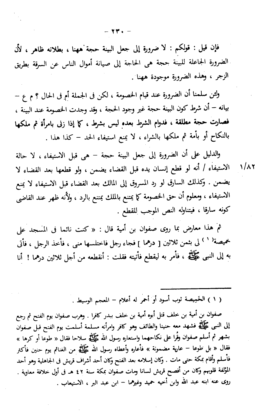 والدليل على أن الضرورة إلى جعل البينة حجة - هي قبل الاستيفاء، لا حالة الاستيفاء أنه لو قطع إنسان يده قبل القضاء يضمن، ولو قطعها بعد القضاء لا يضمن. وكذلك السارق لو رد المسروق إلى المالك بعد القضاء قبل الاستيفاء لا يمنع الاستيفاء، ومعلوم أن حق الخصومة كما يمتنع بالملك يمتنع بالرد، ولأنه ظهر عند القاضي كونه سارقا، فيتناوله النص الموجب للقطع.