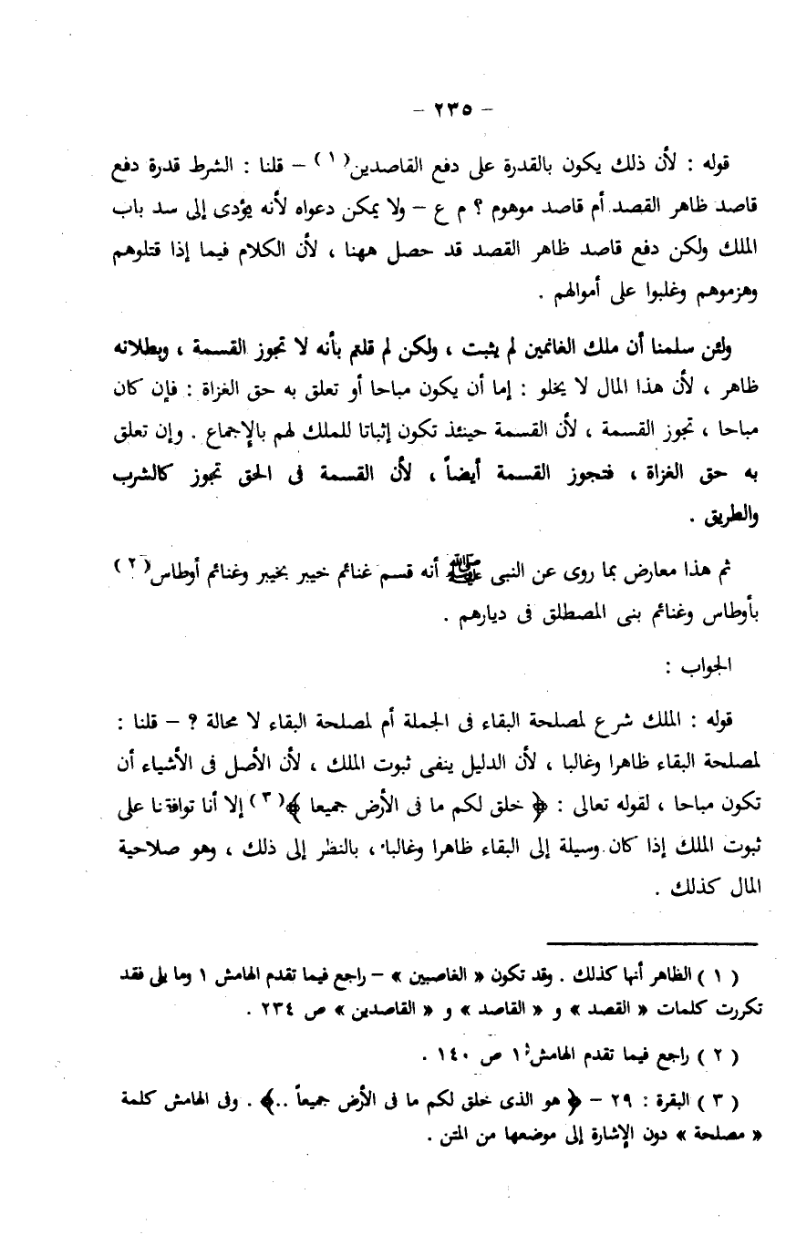 قوله: لأن ذلك يكون بالقدرة على دفع القاصدين - قلنا: الشرط قدرة دفع قاصد ظاهر القصد أم قاصد موهوم؟ م ع - ولا مكن دعواه لأنه يؤدي إلى سد باب الملك ولكن دفع قاصد ظاهر القصد قد حصل ههنا، لأن الكلام فيما إذا قتلوهم وهزموهم وغلبوا على أموالهم.