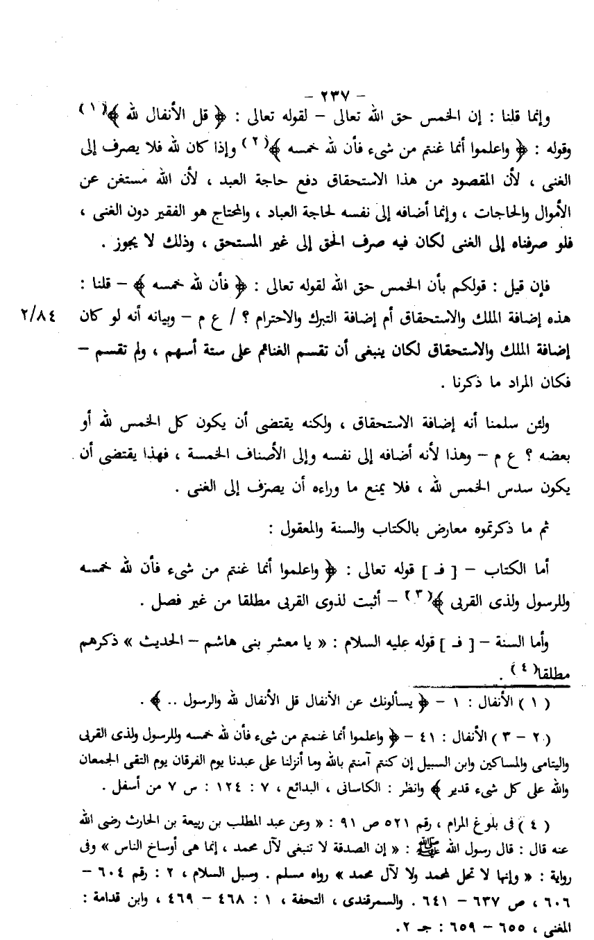 ولئن سلمنا أنه إضافة الاستحقاق، ولكنه يقتضي أن يكون كل الخمس لله أو بعضه؟ ع م- وهذا لأنه أضافه إلى نفسه وإلى الأصناف الخمسة، فهذا يقتضي أن يكون سدس الخمس لله، فلا يمنع ما وراءه أن يصرف إلى الغنى.