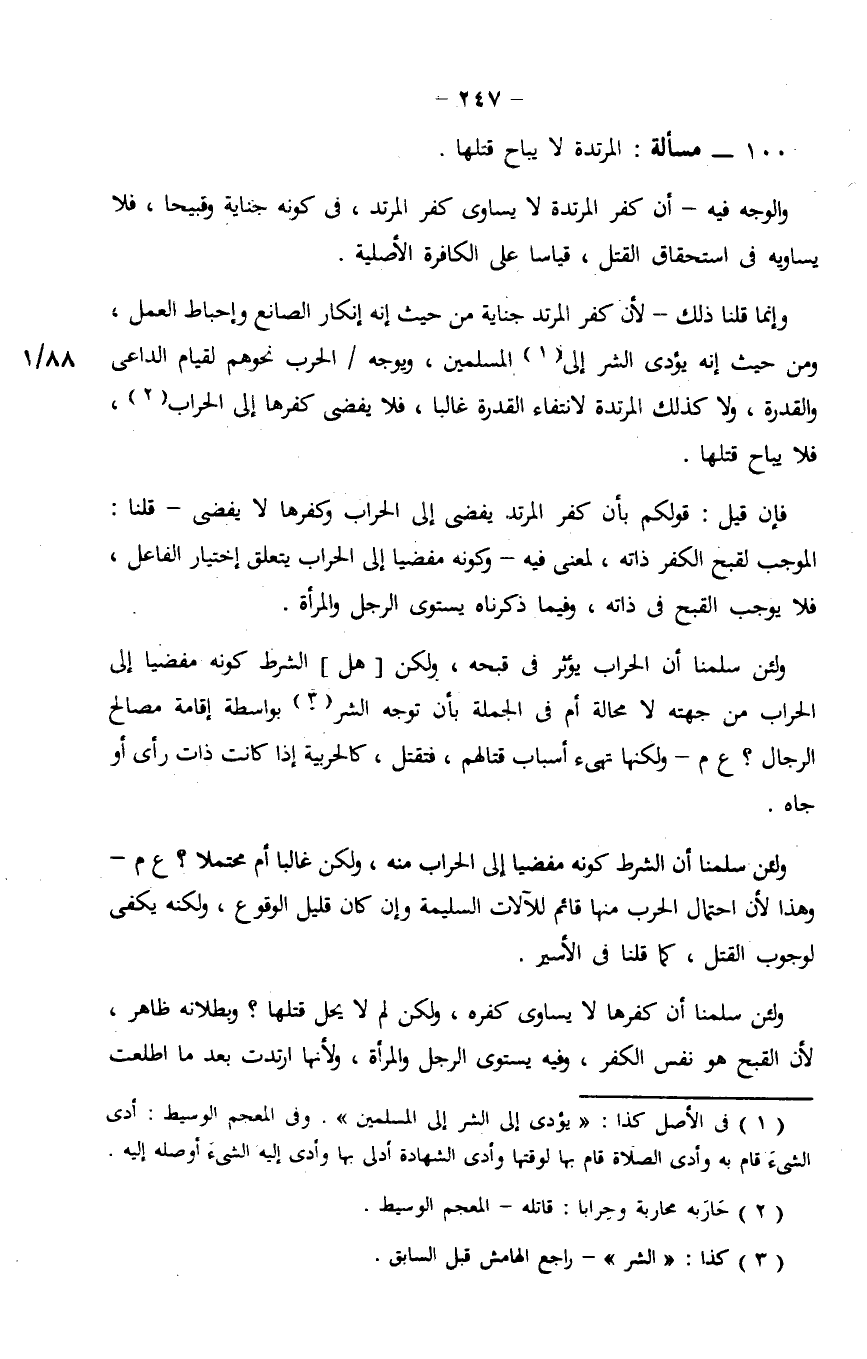 ولئن سلمنا أن الحراب يؤثر في قبحه، ولكن [هل] الشوط كونه مفضيا إلى الحراب من جهته لا محالة أم في الجملة بأن توجه الشر بواسطة إقامة مصالح الرجال؟ ع م - ولكنها تهيئ أسباب قتالهم، فتقتل، كالحربية إذا كانت ذات رأي أو جاه.