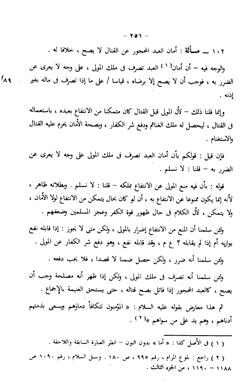 ولئن سلمنا أن المنع من الانتفاع إضرار بالمولى، ولكن متى لا يجوز: إذا قابله نفع يوازيه أم إذا لم يقابله؟ ع م، وقد قابله نفع، وهو دفع شر الكفار عن المولى.