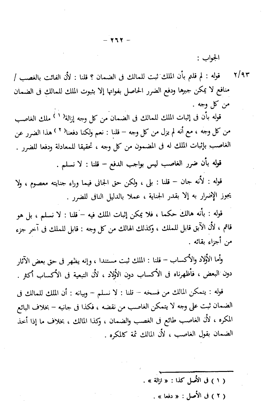 قوله بأن في إثبات الملك للمالك في الضمان من وكل وجه إزالة ملك الغاصب من كل وجه، مع أنه لم يزل من كل وجه - قلنا: نعم ولكنا دفعنا هذا الضرر عن الغاصب بإثبات الملك له في المضمون من كل وجه، تحقيقاً للمعادلة ودفعاً للضرر.