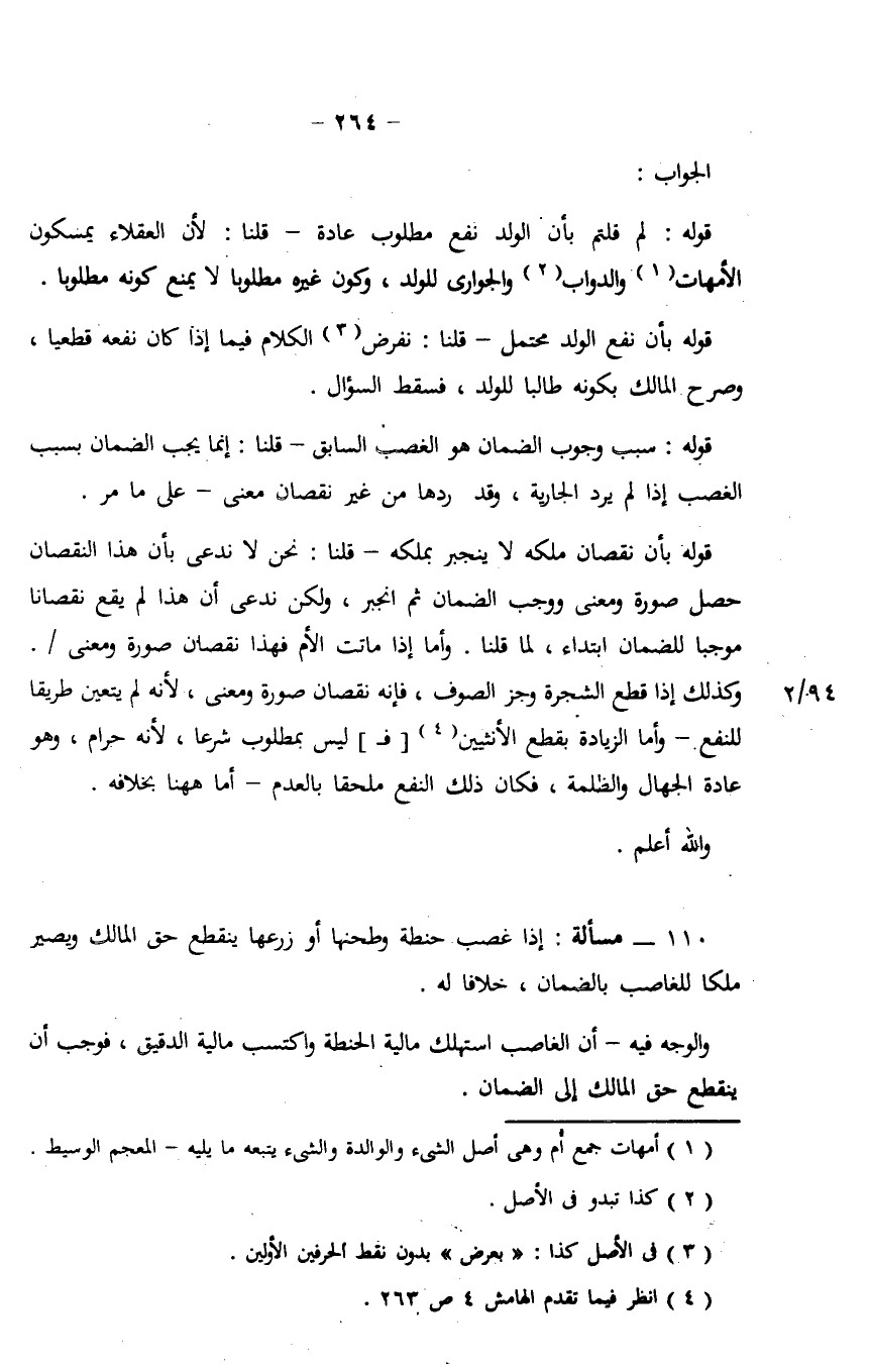 قوله بأن نقصان ملكه لا ينجبر بملكه - قلنا: نحن لا ندعي بأن هذا النقصان حصل صورة ومعنى ووجب الضمان ثم انجبر، ولكن ندعي أن هذا لم يقع نقصاناً موجباً للضمان ابتداء، لما قلنا. وأما إذا ماتت الأم فهذا نقصان صورة ومعنى/ وكذلك إذا قطع الشجرة وجز الصوف، فإنه نقصان صورة ومعنى، لأنه لم يتعين طريقاً للنفع - وأما الزيادة بقطع الأنثيين [فـ] ليس بمطلوب شرعاً، لأنه حرام، وهو عادة الجهال والظلمة، فكان ذلك النفع ملحقاً بالعدم - أما ههنا بخلافه.