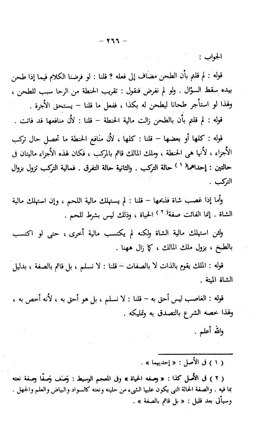 قوله: الملك يقوم بالذات لا بالصفات - قلنا: لا نسلم، بل قائم بالصفة، بدليل الشاة الميتة.