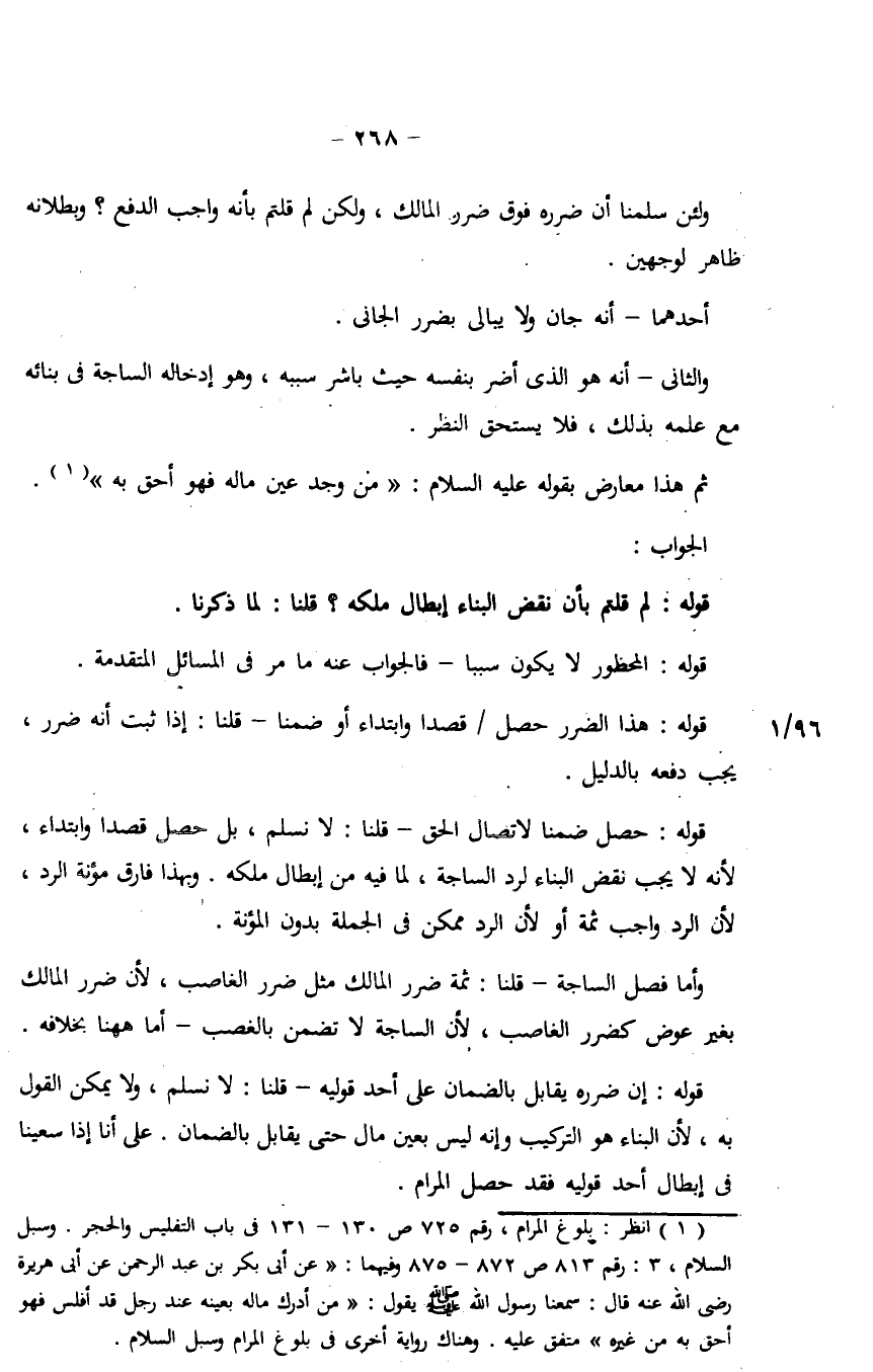 قوله: إن ضرره يقابل بالضمان على أحد قوليه - قلنا: لا نسلم، ولا يمكن القول به، لأن البناء هو التركيب وإنه ليس بعين مال حتى يقابل بالضمان، على أنا إذا سعينا في إبطال أحد قوليه فقد حصل المرام.