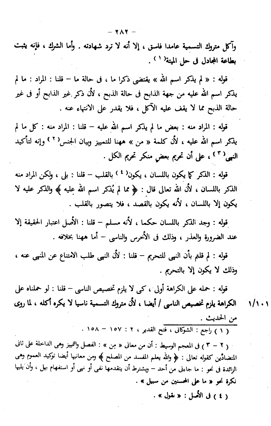 قوله: حمله على الكراهة أولى، كي لا يلزم تخصيص الناسي - قلنا: لو حملناه على الكراهة يلزم تخصيص الناسي/ أيضاً، لأن متروك التسمية ناسياً لا يكره أكله، لما روي في الحديث.