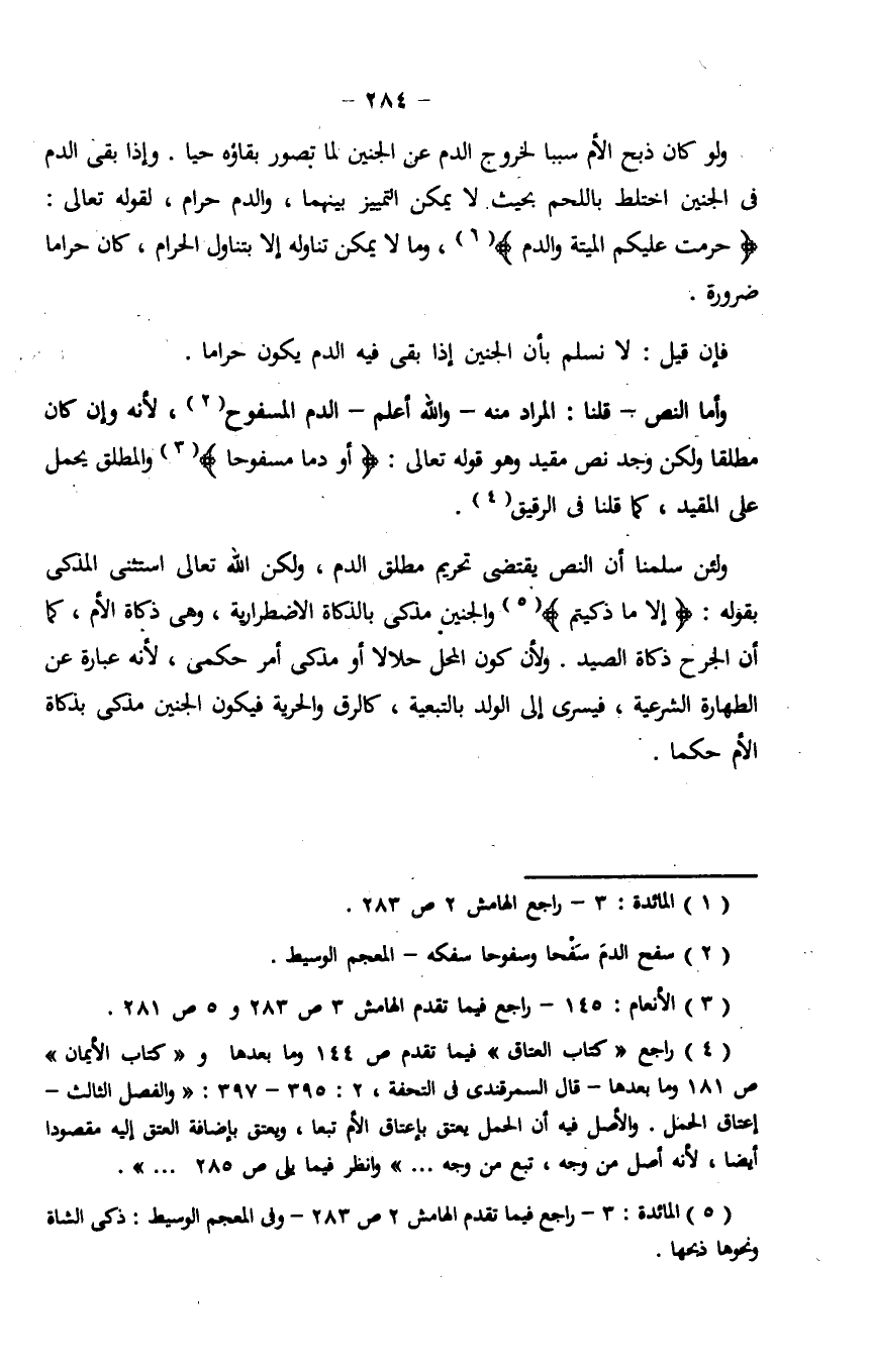ولئن سلمنا أن النص يقتضي تحريم مطلق الدم، ولكن الله تعالى استثنى المذكي بقوله: {إِلاَّ مَا ذَكَّيْتُمْ} والجنين مذكي بالذكاة الاضطرارية، وهي ذكاة الأم، كما أن الجرح ذكاة الصيد. ولأن كون المحل حلالاً أو مذكي أمر حكمي، لأنه عبارة عن الطهارة الشرعية، فيسري إلى الولد بالتبعية، كالرق والحرية فيكون الجنين مذكي بذكاة الأم حكماً.