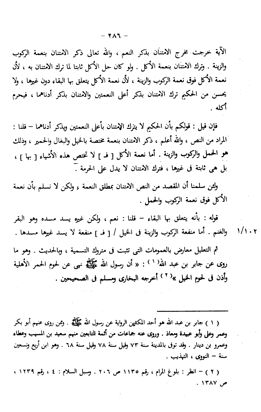 فإن قيل: قولكم بأن الحكيم لا يترك الامتنان بأعلى النعمتين ويذكر أدناهما - قلنا: المراد من النص والله أعلم، ذكر الامتنان بنعمة مختصة بالخيل والبغال والحمير، وذلك هو الحمل والركوب والزينة. أما نعمة الأكل [فـ] لا تختص هذه الأشياء [بها]، بل هي ثابتة في غيرها، فترك الامتنان لا يدل على الحرمة.