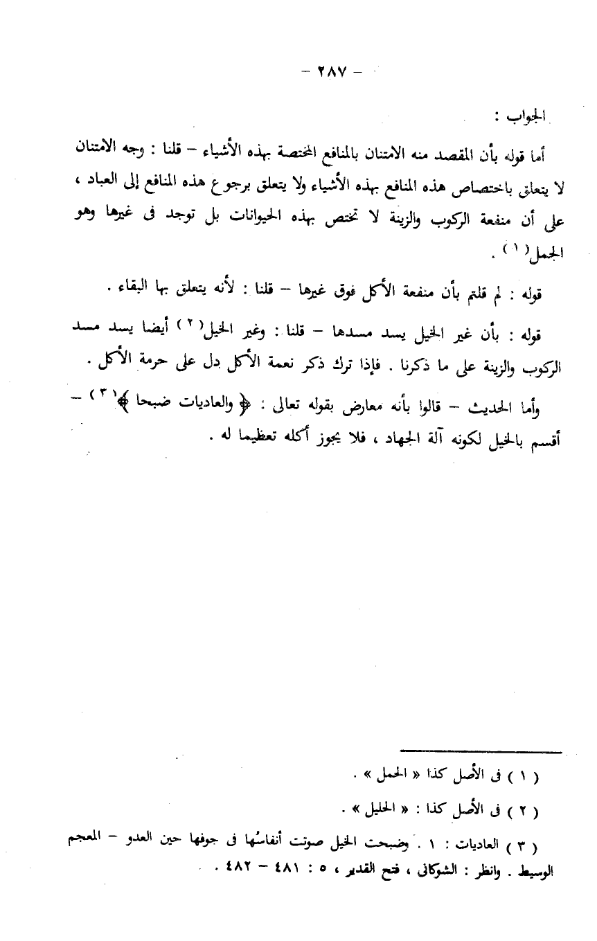 أما قوله بأن المقصد منه الامتنان بالمنافع المختصة بهذه الأشياء - قلنا: وجه الامتنان لا يتعلق باختصاص هذه المنافع بهذه الأشياء ولا يتعلق برجوع هذه المنافع إلى العباد، على أن منفعة الركوب والزينة لا تختص بهذه الحيوانات بل توجد في غيرها وهو الجمل.