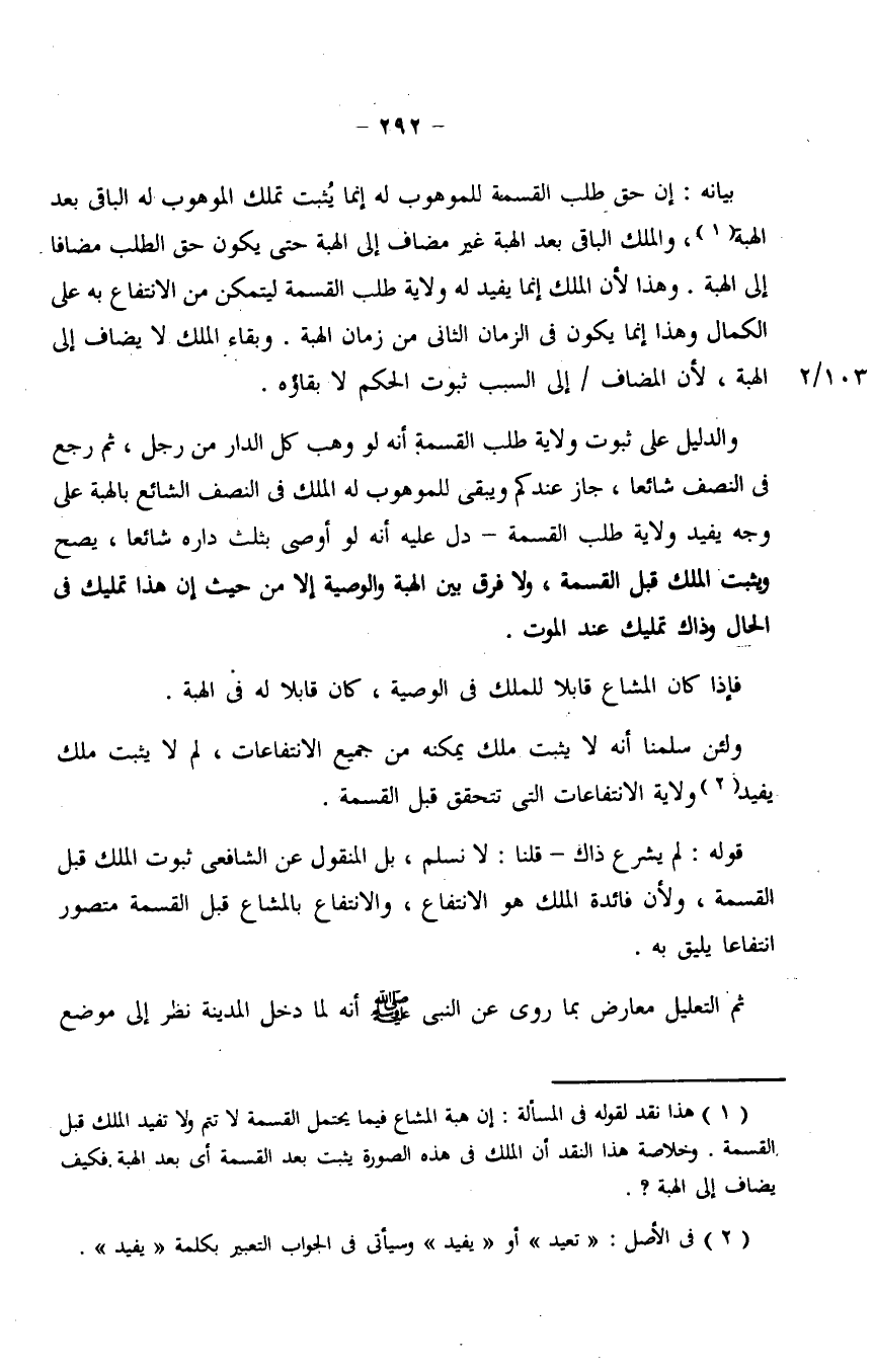 بيانه: إن حق طلب القسمة للموهوب له إنما يثبت تملك الموهوب له الباقي بعد الهبة، والملك الباقي بعد الهبة غير مضاف إلى الهبة حتى يكون حق الطلب مضافاً إلى الهبة. وهذا لأن الملك إنما يفيد له ولاية طلب القسمة ليتمكن من الانتفاع به على الكمال وهذا إنما يكون في الزمان الثاني من زمان الهبة. وبقاء الملك لا يضاف إلى الهبة، لأن المضاف/ إلى السبب ثبوت الحكم لا بقاؤه.