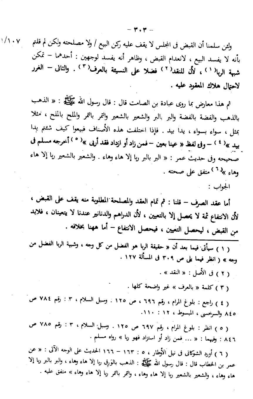 ولئن سلمنا أن القبض في المجلس لا يقف عليه ركن البيع/ ولا مصلحته ولكن لم قلتم بأنه لا يفسد البيع، لانعدام القبض، وظاهر أنه يفسد لوجهين: أحدهما - تمكن شبهة الربا، لأن للنقد فضلاً على النسيئة بالعرف. والثاني - الغرر لاحتمال هلاك المعقود عليه.