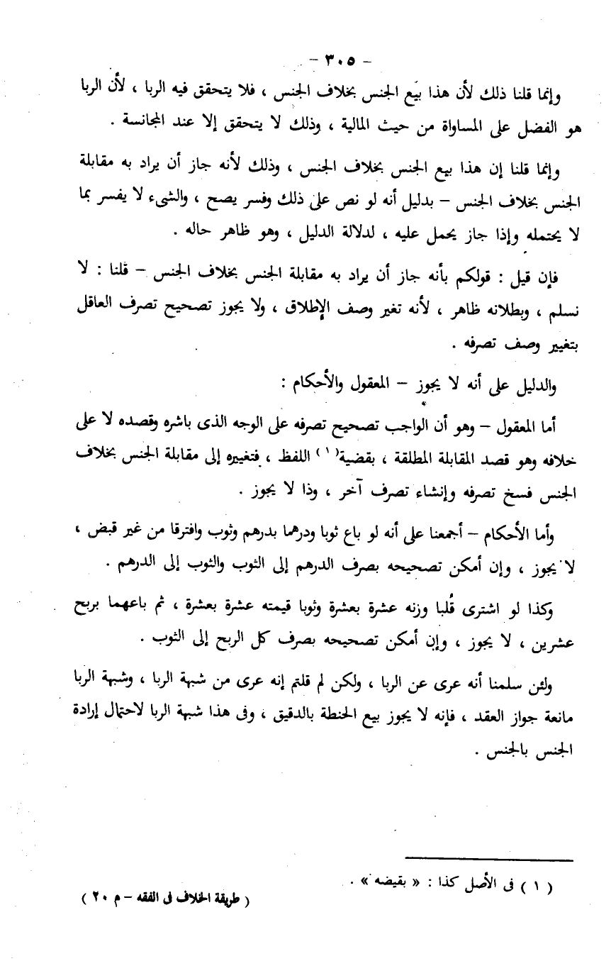 أما المعقول - وهو أن الواجب تصحيح تصرفه على الوجه الذي باشره وقصده لا على خلافه وهو قصد المقابلة المطلقة، بقضية اللفظ، فتغييره إلى مقابلة الجنس بخلاف الجنس فسخ تصرفه وإنشاء تصرف آخر، وذا لا يجوز.