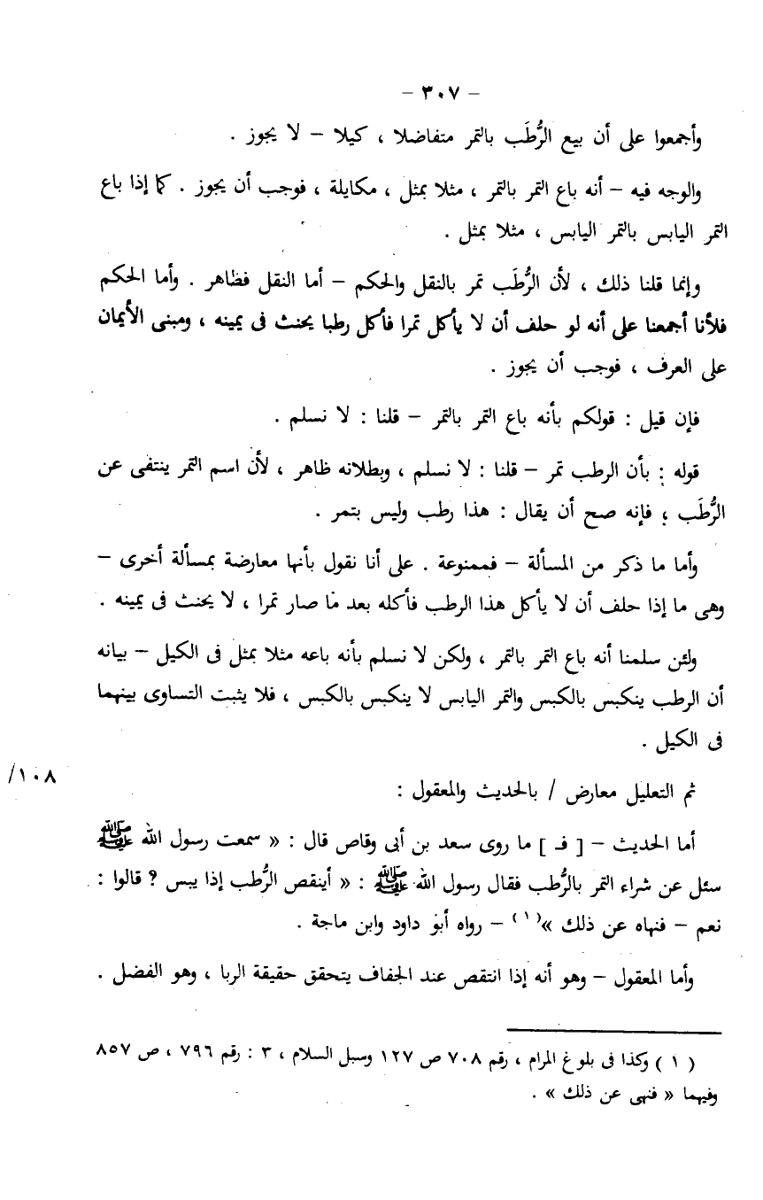 أما الحديث -[ف] ما روى سعد بن أبي وقاص قال: "سمعت رسول الله صلى الله عليه وسلم سئل عن شراء التمر بالرطب فقال رسول الله صلى الله عليه وسلم: "أينقص الرُّطب إذا يبس؟ قالوا: نعم - فنهاه عن ذلك"- رواه أبو داود وابن ماجة.