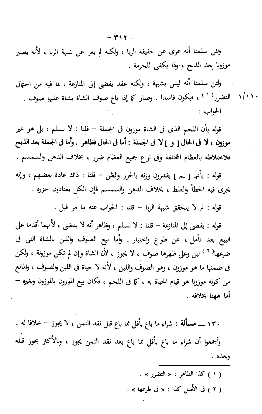 قوله بأن اللحم الذي في الشاة موزون في الجملة - قلنا: لا نسلم، بل هو غير موزون، لا في الحال [و] لا في الجملة: أما في الحال فظاهر. وأما في الجملة بعد الذبح فاختلاطه بالعظام المختلفة وفي نزع جميع العظام ضرر، بخلاف الدهن والسمسم.
