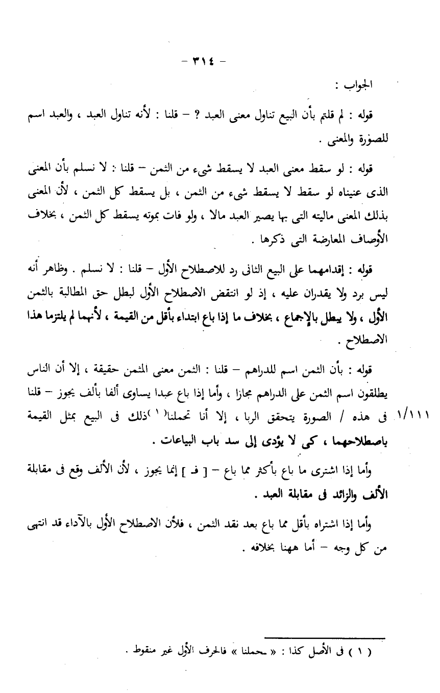 قوله: بأن الثمن اسم للدراهم - قلنا: الثمن معنى المثمن حقيقة، إلا أن الناس يطلقون اسم الثمن على الدراهم مجازاً، وأما إذا باع عبداً يساوي ألفاً بألف يجوز - قلنا في هذه / الصورة يتحقق الربا، إلا أنا تحملنا ذلك في البيع بمثل القيمة باصطلاحهما، كي لا يؤدي إلى سد باب البياعات.
