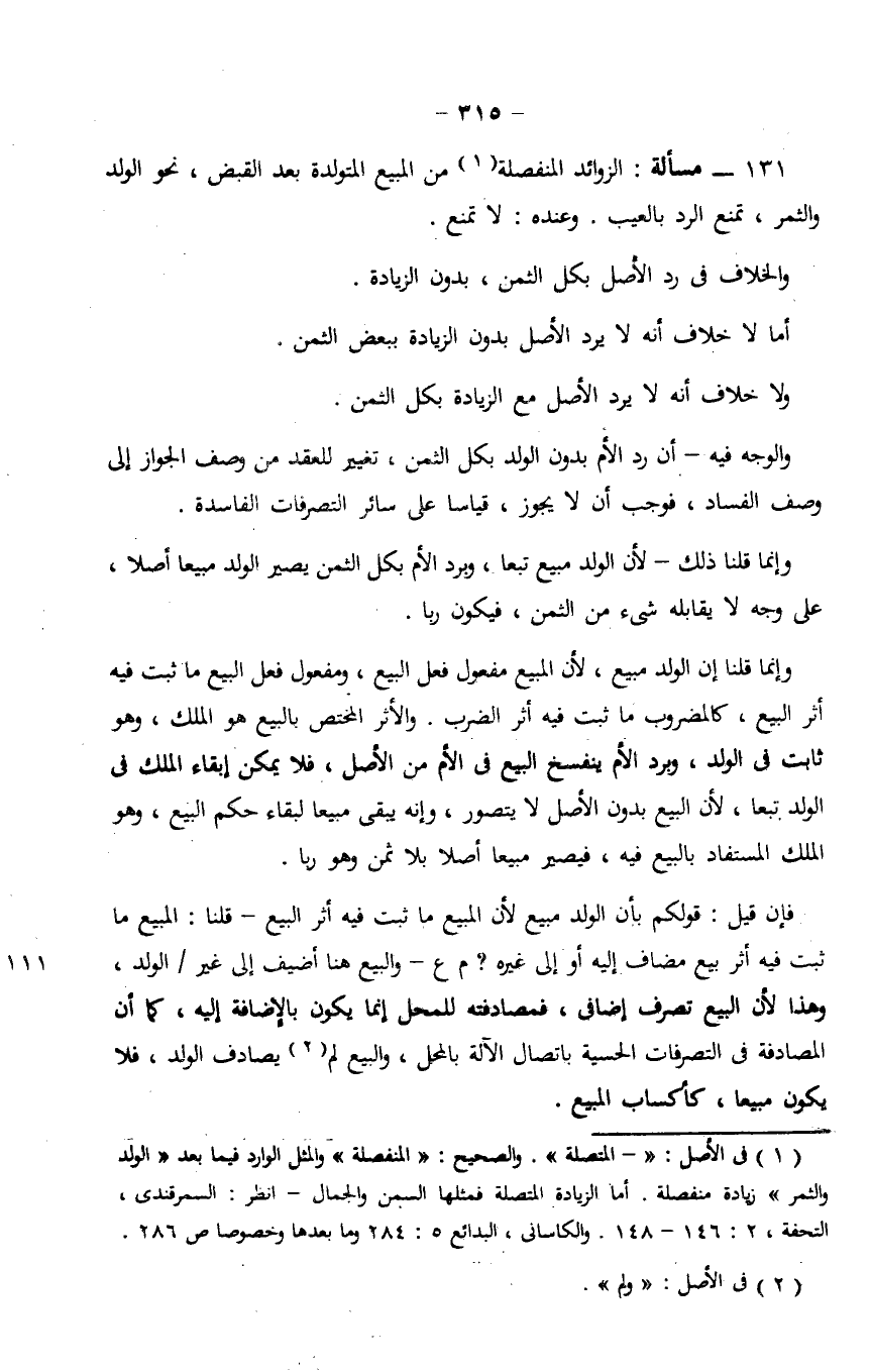 131 - مسألة: الزوائد المنفصلة من البيع المتولدة بعد القبض، نحو الولد والثمر، تمنع الرد بالعيب. وعنده: لا تمنع.