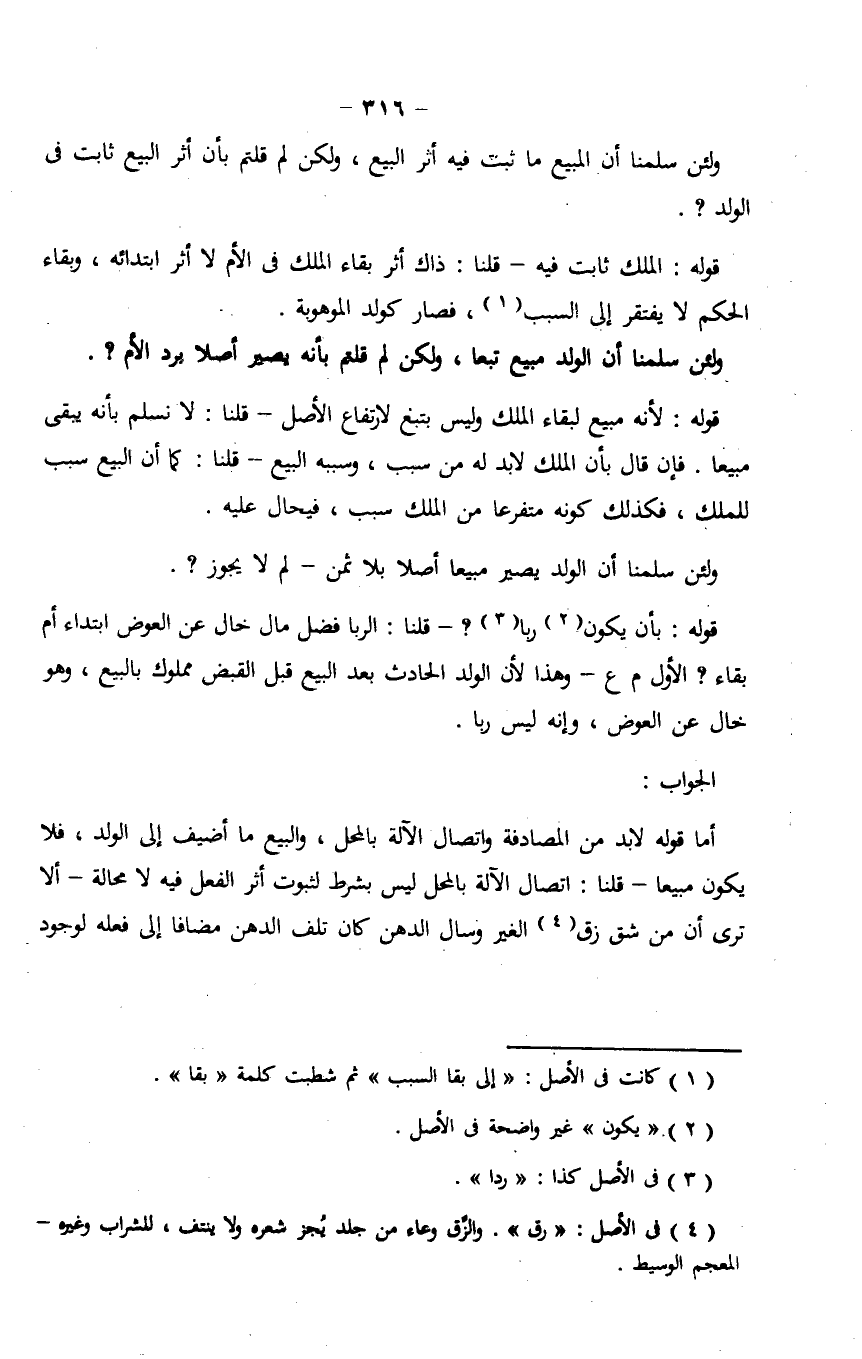 قوله: بأن يكون ربا؟ - قلنا: الربا فضل مال خال عن العوض ابتداء أم بقاء؟ الأول م ع - وهذا لأن الولد الحادث بعد البيع قبل القبض مملوك بالبيع، وهو خال عن العوض، وإنه ليس ربا.
