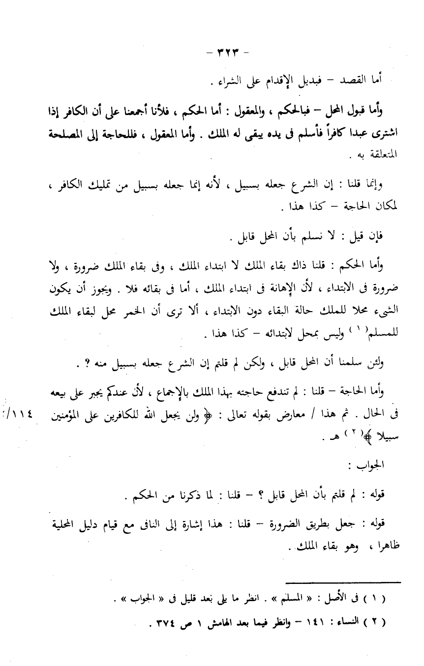 وأما الحكم: قلنا ذاك بقاء الملك لا ابتداء الملك، وفي بقاء الملك ضرورة، ولا ضرورة في الابتداء، لأن الإهانة في ابتداء الملك، أما في بقائه فلا. ويجوز أن يكون الشيء محلاً للملك حالة البقاء دون الابتداء، ألا ترى أن الخمر محل لبقاء الملك للمسلم وليس بمحل لابتدائه - كذا هذا.