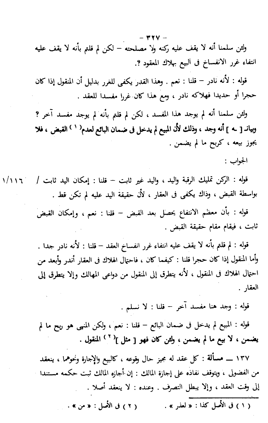 قوله: المبيع لم يدخل في ضمان البائع - قلنا: نعم، ولكن المنهي هو ربح ما لم يضمن، لا بيع ما لم يضمن، ولئن كان فهو [مثل] المنقول.