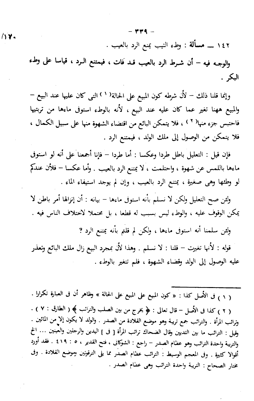142 - مسألة: وطء الثيب يمنع الرد بالعيب.