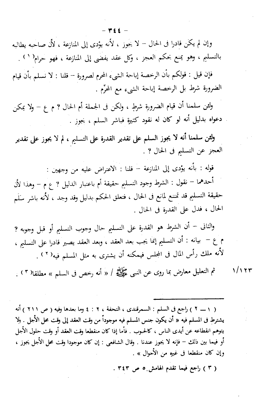 والثاني - أن الشرط هو القدرة على التسليم حال وجوب التسليم أو قبل وجوبه؟ م ع - بيانه: أن التسليم إنما يجب بعد العقد، وبعد العقد يصير قادراً على التسليم، لأنه ملك رأس المال في المجلس فيمكنه أن يشتري به مثل المسلم فيه.