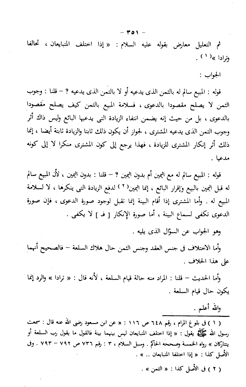 قوله: المبيع سالم له بالثمن الذي يدعيه أو لا بالثمن الذي يدعيه؟ - قلنا: وجوب الثمن لا يصلح مقصودا بالدعوى، فسلامة المبيع بالثمن كيف يصلح مقصودا بالدعوى، بل من حيث إنه يضمن انتفاء الزيادة التي يدعيها البائع وليس ذاك أثر وجوب الثمن الذي يدعيه المشترى، لجواز أن يكون ذلك ثابتا والزيادة ثابتة أيضا، إنما ذلك أثر إنكار المشترى للزيادة، فهذا يرجع إلى كون المشترى منكرا لا إلى كونه مدعيا.