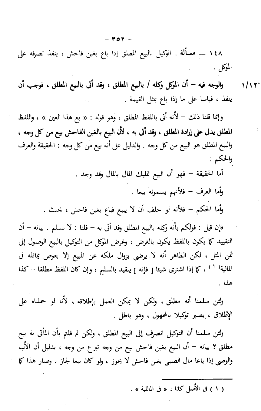 148 - مسألة. الوكيل بالبيع المطلق إذا باع بغبن فاحش، ينفذ تصرفه على الموكل.
