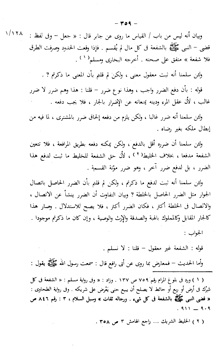 ولئن سلمنا أنه ثبت لدفع ما ذكرتم، ولكن لم قلتم بأن الضرر الحاصل باتصال الجوار مثل الضرر الحاصل بالخلطة؟ وبيان التفاوت أن الضرر ينشأ عن الاتصال، والاتصال في الخلطة أكثر، فكان الضرر أكثر، فلا يصح الاستدلال. وصار هذا كالجار المقابل وكالمملوك بالهبة والصدقة والإرث والوصية، وإن كان ما ذكرتم موجودا.