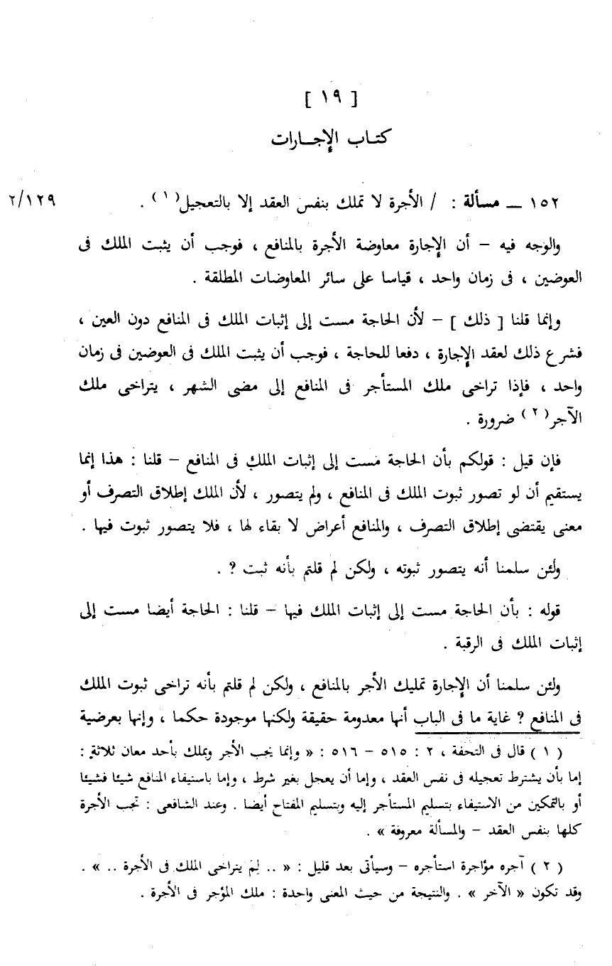 152 - مسألة: الأجرة لا تملك بنفس العقد إلا بالتعجيل.