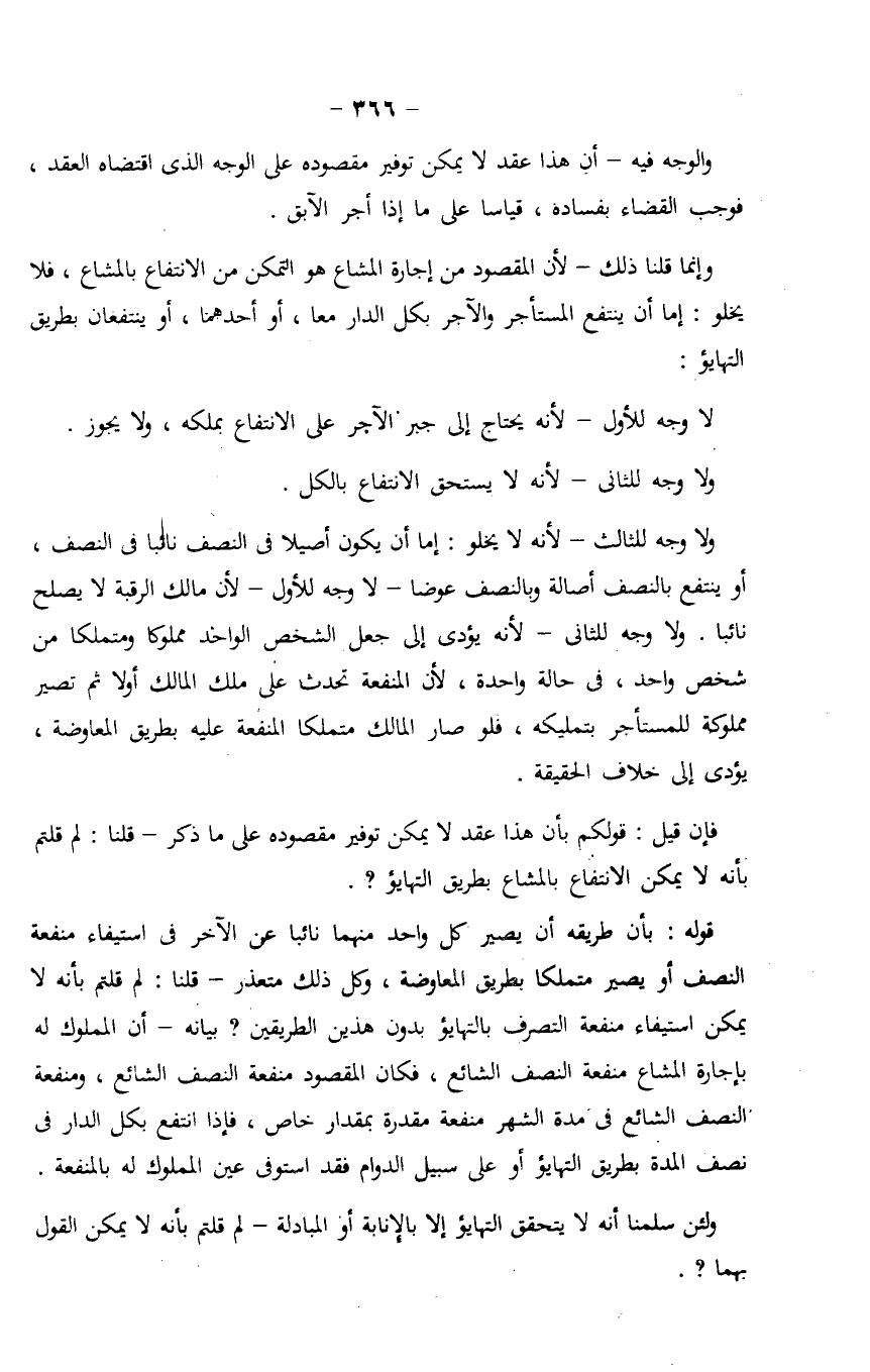 ولا وجه للثالث - لأنه لا يخلو: إما أن يكون أصيلاً في النصف نائباً في النصف، أو ينتفع بالنصف أصالة وبالنصف عوضاً - لا وجه للأول - لأن مالك الرقبة لا يصلح نائباً. ولا وجه للثاني - لأنه يؤدي إلى جعل الشخص الواحد مملوكاً وممتلكاً من شخص واحد، في حالة واحدة، لأن المنفعة تحدث على ملك المالك أولاً ثم تصير مملوكة للمستأجر بتمليكه، فلو صار المالك ممتلكاً المنفعة عليه بطريق المعاوضة، يؤدي إلى خلاف الحقيقة.