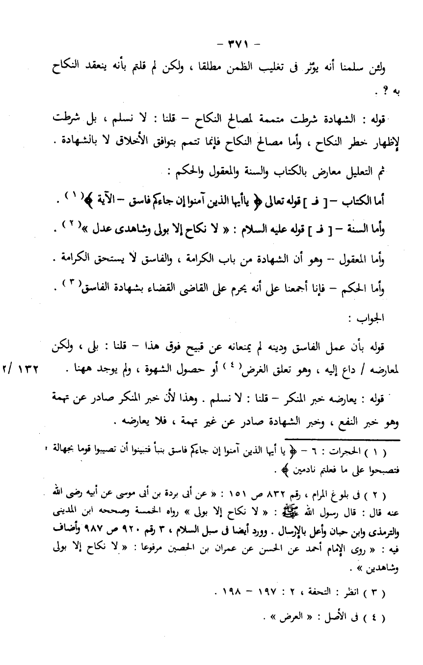 قوله: الشهادة شرطت متممة لمصالح النكاح - قلنا: لا نسلم، بل شرطت لإظهار خطر النكاح، وأما مصالح النكاح فإنما تتمم بتوافق الأخلاق لا بالشهادة.