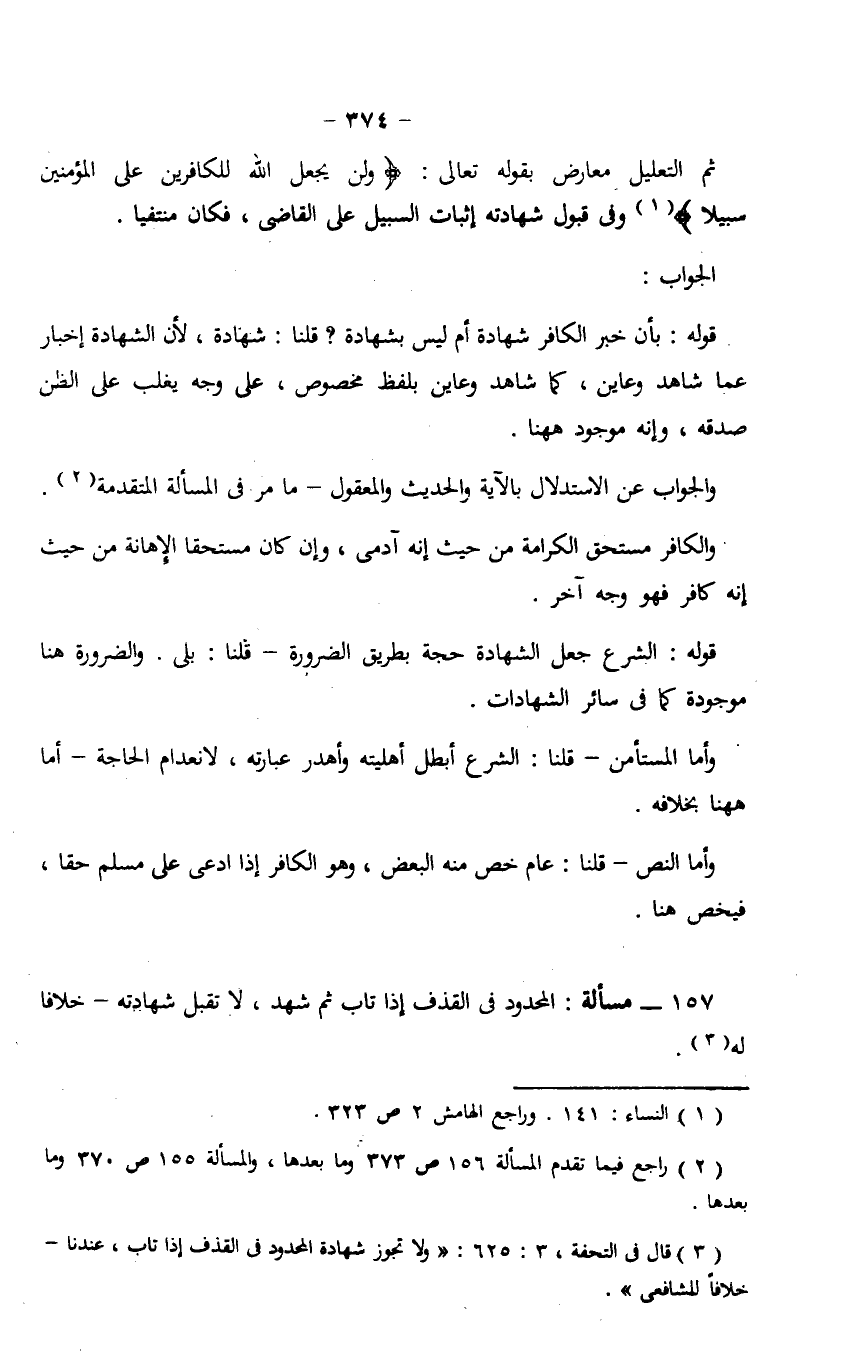 ثم التعليل معارض بقوله تعالى: {وَلَن يَجْعَلَ اللهُ لِلْكَافِرِينَ عَلَى الْمُؤْمِنِينَ سَبِيلاً} وفي قبول شهادته إثبات السبيل على القاضي، فكان منتفياً.