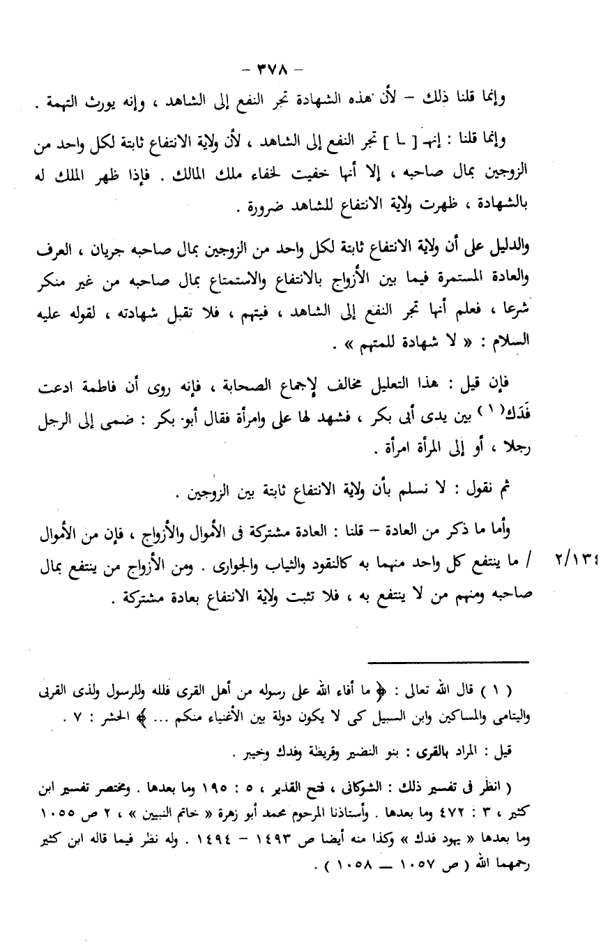 وإنما قلنا: إنهـ[ـــا] تجر النفع إلى الشاهد، لأن ولاية الانتفاع ثابتة لكل واحد من الزوجين بمال صاحبه، إلا أنها خفيت لخفاء ملك المالك. فإذا ظهر الملك له بالشهادة، ظهرت ولاية الانتفاع للشاهد ضرورة.
