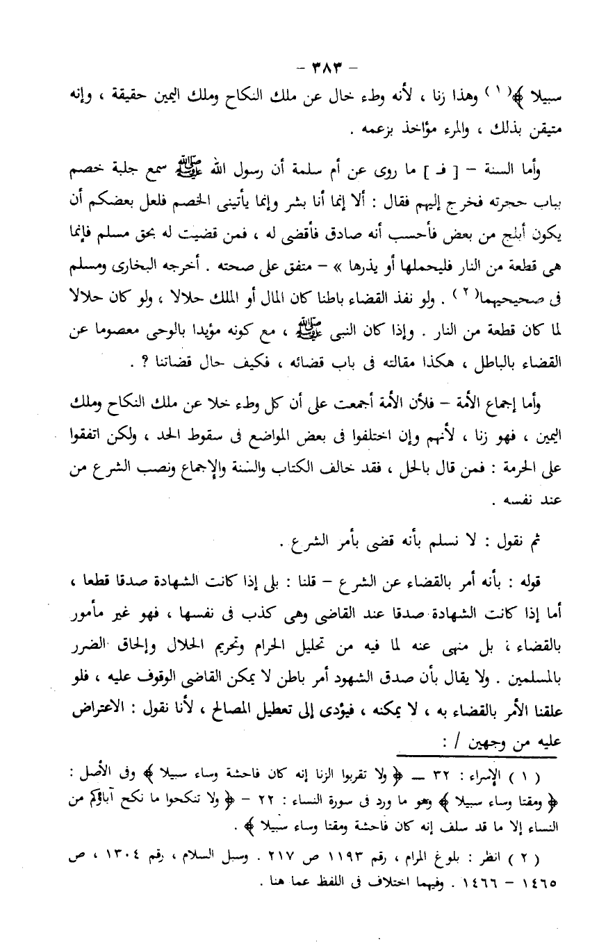 وأما السنة ـ[فـ] ما روي عن أم سلمة أن رسول الله صلى الله عليه وسلم سمه جلبة خصم بباب حجرته فخرج إليهم فقال: ألا إنما أنا بشر وإنما يأتيني الخصم فلعل بعضكم أن يكون أبلج من بعض فأحسب أنه صادق فأقضي له، فمن قضيت له بحق مسلم فإنما هي قطعة من النار فليحملها أو يذرها" - متفق على صحته. أخرجه البخاري ومسلم في صحيحيهما. ولو نفذ القضاء بطناً كان المال أو الملك حلالاً، ولو كان حلالاً لما كان قطعة من النار. وإذا كان النبي صلى الله عليه وسلم، مع كونه مؤيداً بالوحي معصوماً عن القضاء بالباطل، هكذا مقالته في باب قضائه، فكيف حال قضاتنا؟