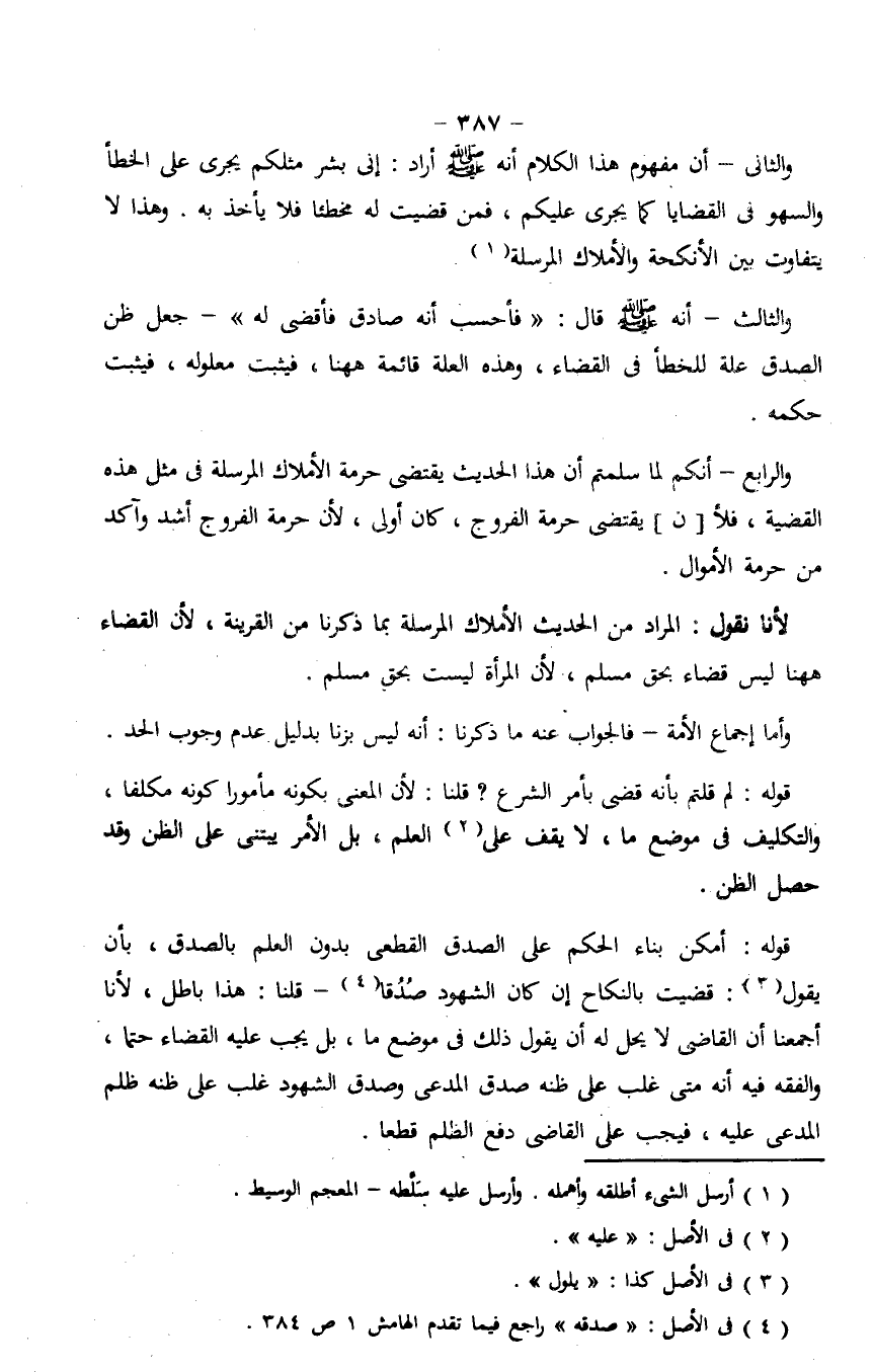 والثاني - أن مفهوم هذا الكلام أنه صلى الله عليه وسلم أراد: إني بشر مثلكم يجري على الخطأ والسهو في القضايا كما يجري عليكم، فمن قضيت له مخطئاً فلا يأخذ به. وهذا لا يتفاوت بين الأنكحة والأملاك المرسلة.
