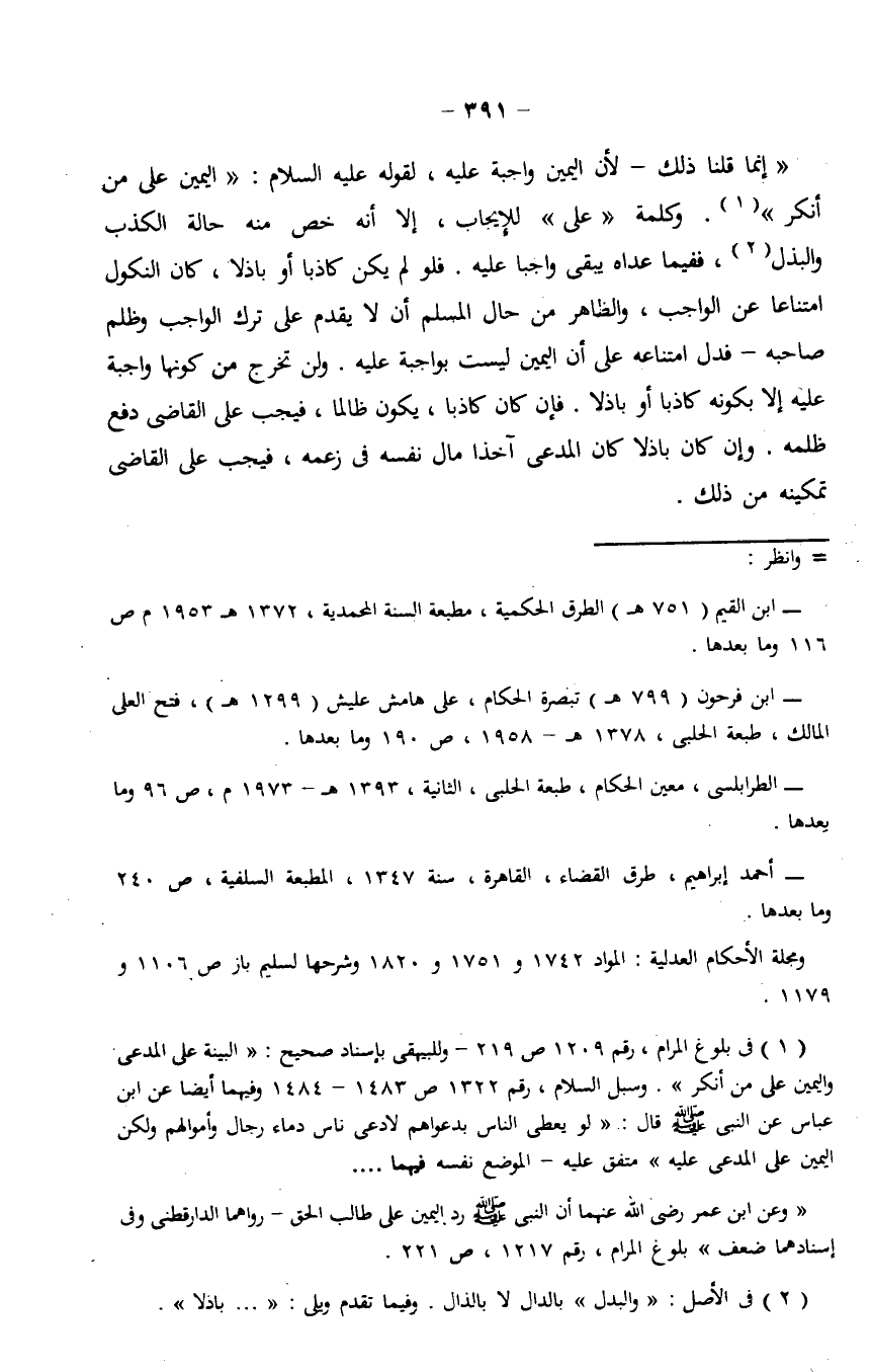 "إنما قلنا ذلك - لأن اليمين واجبة عليه، لقوله عليه السلام: "اليمين على من أنكر". وكلمة "على" للإيجاب، إلا أ، هـ خص منه حالة الكذب والبذل، ففيما عداه يبقى واجباً عليه. فلو لم يكن كاذباً أو باذلاً، كان النكول امتناعاً عن الواجب، والظاهر من حال المسلم أن لا يقدم على ترك الواجب وظلم صاحبه - فدل امتناعه على أن اليمين ليست بواجبة عليه. ولن تخرج من كونها واجبة عليه إلا بكونه كاذباً أو باذلاً. فإن كان كاذباً، يكون ظالماً، فيجب على القاضي دفع ظلمه. وإن كان باذلاً كان المدعي آخذاً مال نفسه في زعمه، فيجب على القاضي تمكينه من ذلك.