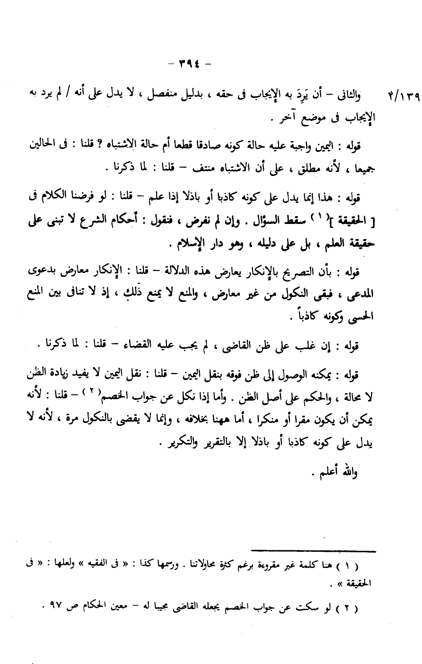 قوله: يمكنه الوصول إلى ظن فوقه بنقل اليمين - قلنا: نقل اليمين لا يفيده زيادة الظن لا محالة، والحكم على أصل الظن. وأما إذا نكل عن جواب الخصم - قلنا: لأنه يمكن أن يكون مقراً أو منكراً، أما ههنا بخلافه، وإنما لا يقضي بالنكول مرة، لأنه لا يدل على كونه كاذباً أو باذلاً إلا بالتقرير والتكرير.