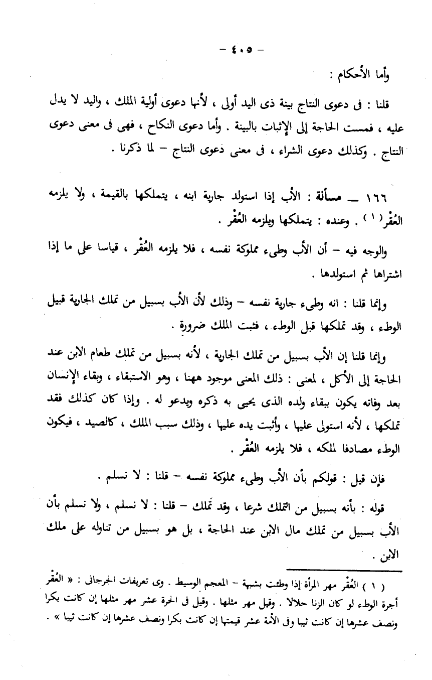 وإنما قلنا إن الأب بسبيل من تملك الجارية، لأنه بسبيل من تملك طعام الابن عند الحاجة إلى الأكل، لمعنى: ذلك المعنى موجود ههنا، وهو الاستبقاء، وبقاء الإنسان بعد وفاته يكون ببقاء ولده الذي يحيي به ذكره ويدعو له، وإذا كان كذلك فقد تملكها، لأنه استولى عليها، وأثبت يده عليها، وذلك سبب الملك، كالصيد، فيكون الوطء مصادفاً لملكه، فلا يلزمه العقر.