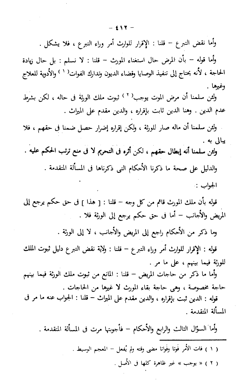 وأما ما ذكر من حاجات المريض- قلنا: المانع من ثبوت ملك الورثة فيما بينهم حاجة مخصوصة، وهى حاجة بقاء المورث لا غيرها من الحاجات.
