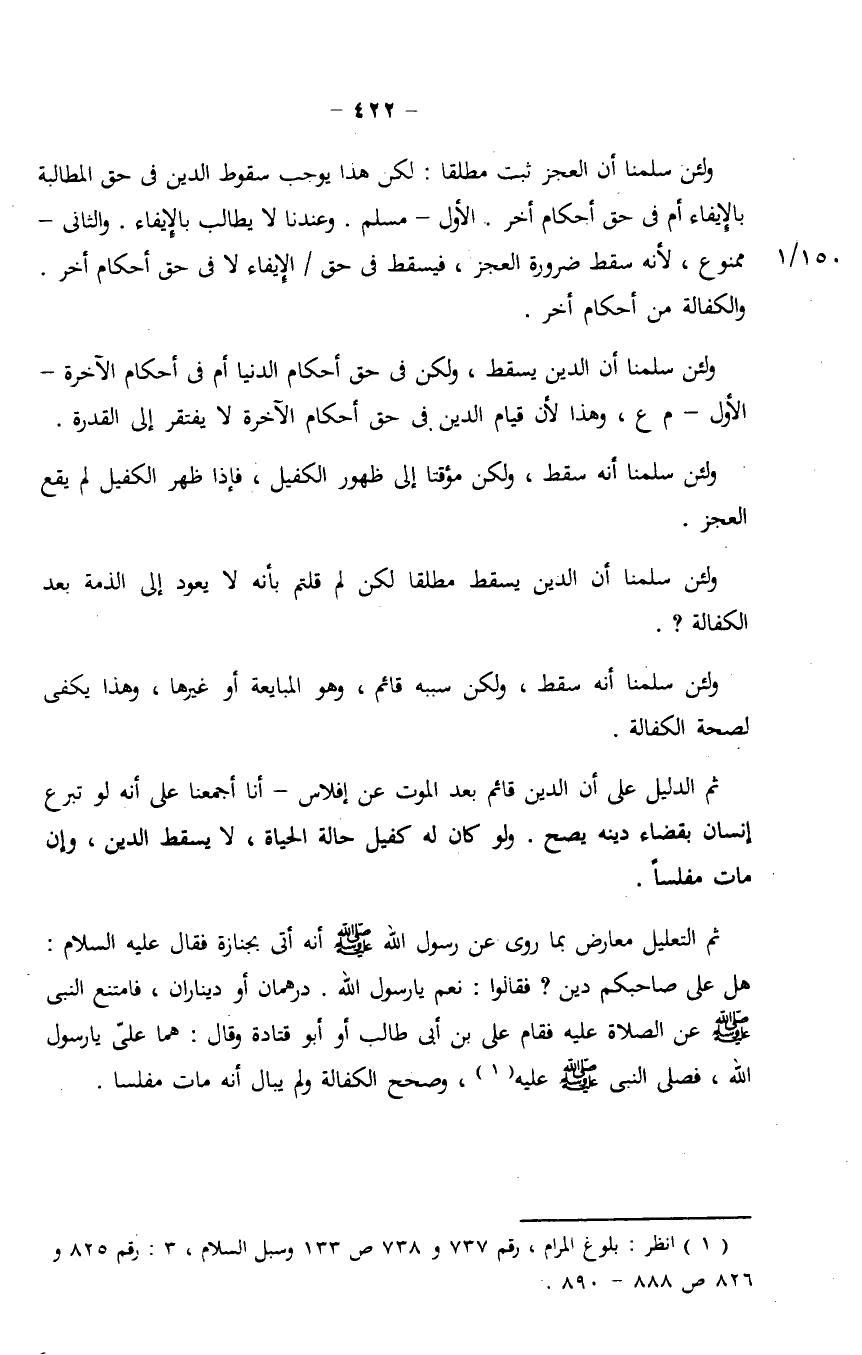 ولئن سلمنا أن العجز ثبت مطلقا: لكن هذا يوجب سقوط الدين في حق المطالبة بالإيفاء أم في حق أحكام أخر .. الأول- مسلم. وعندنا لا يطالب بالإيفاء. والثاني- ممنوع، لأنه سقط ضرورة العجز، فيسقط في حق/ الإيفاء لا في حق أحكام أخر. والكفالة من أحكام أخر.