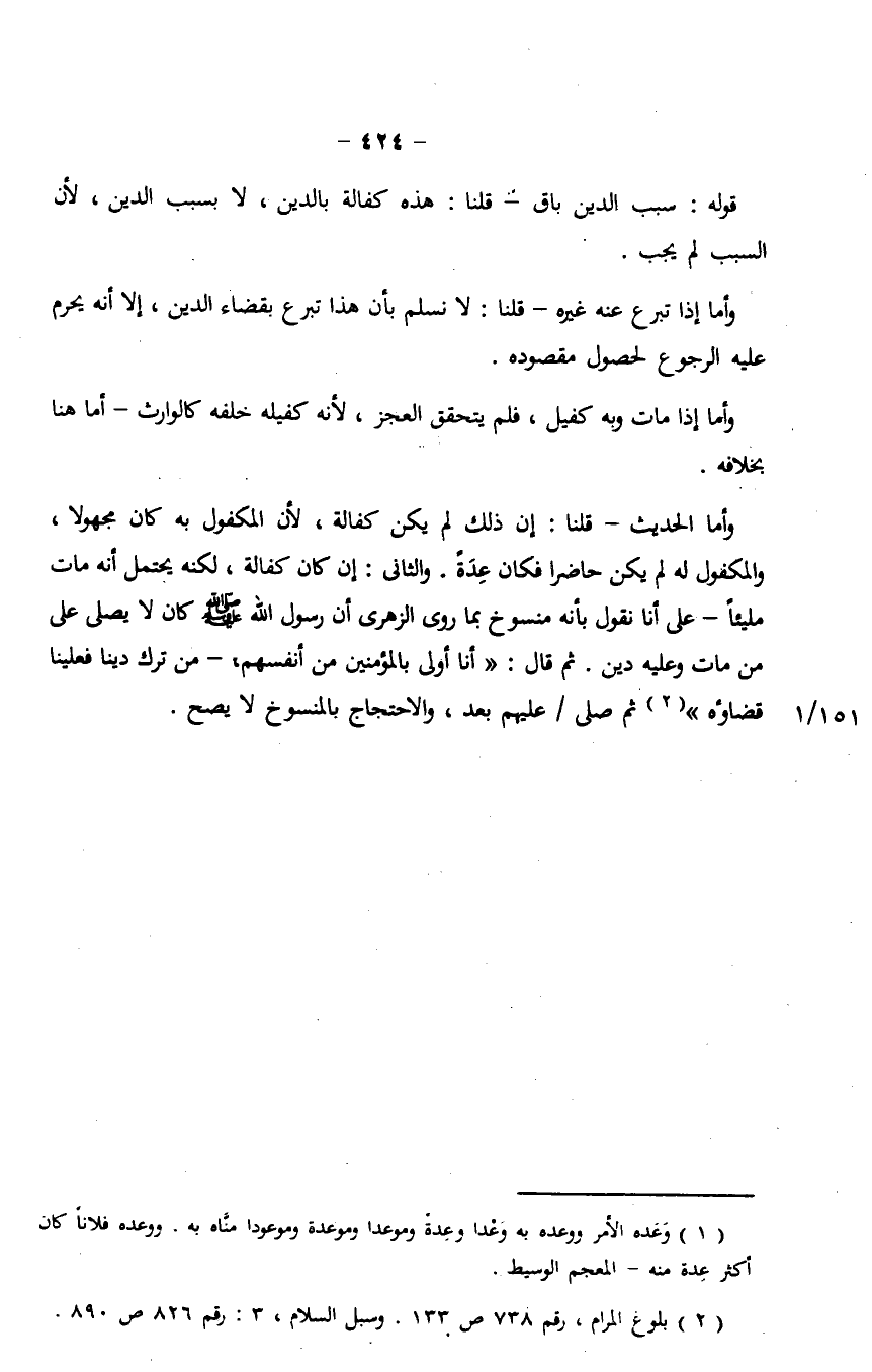 وأما الحديث- قلنا: إن ذلك لم يكن كفالة، لأن المكفول به كان مجهولا، والمكفول له لم يكن حاضرا فكان عدة. والثاني: إن كان كفالة، لكنه يحتمل أنه مات مليئاً- على أنا نقول بأنه منسوخ بما روى الزهري أن رسول الله صلي الله عليه وسلم كان لا يصلى على من مات وعليه دين. ثم قال: "أنا أولى بالمؤمنين من أنفسهم، - من ترك دينا فعلينا قضاؤه" ثم صلى/ عليهم بعد، والاحتجاج بالمنسوخ لا يصح.