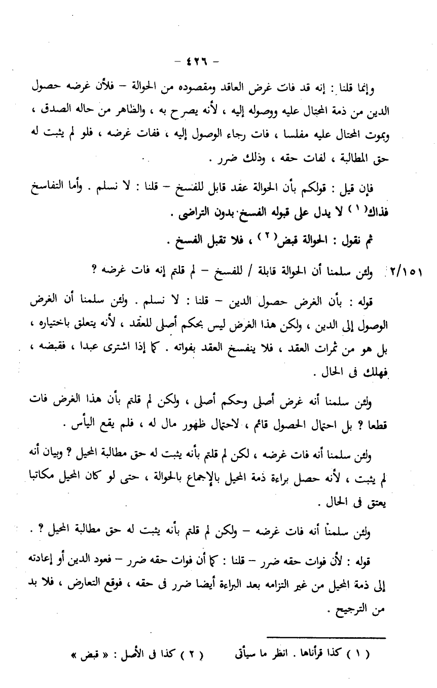 فإن قيل: قولكم بأن الحوالة عقد قابل للفسخ- قلنا: لا نسلم. وأما التفاسخ فذاك لا يدل على قبوله الفسخ بدون التراضي.